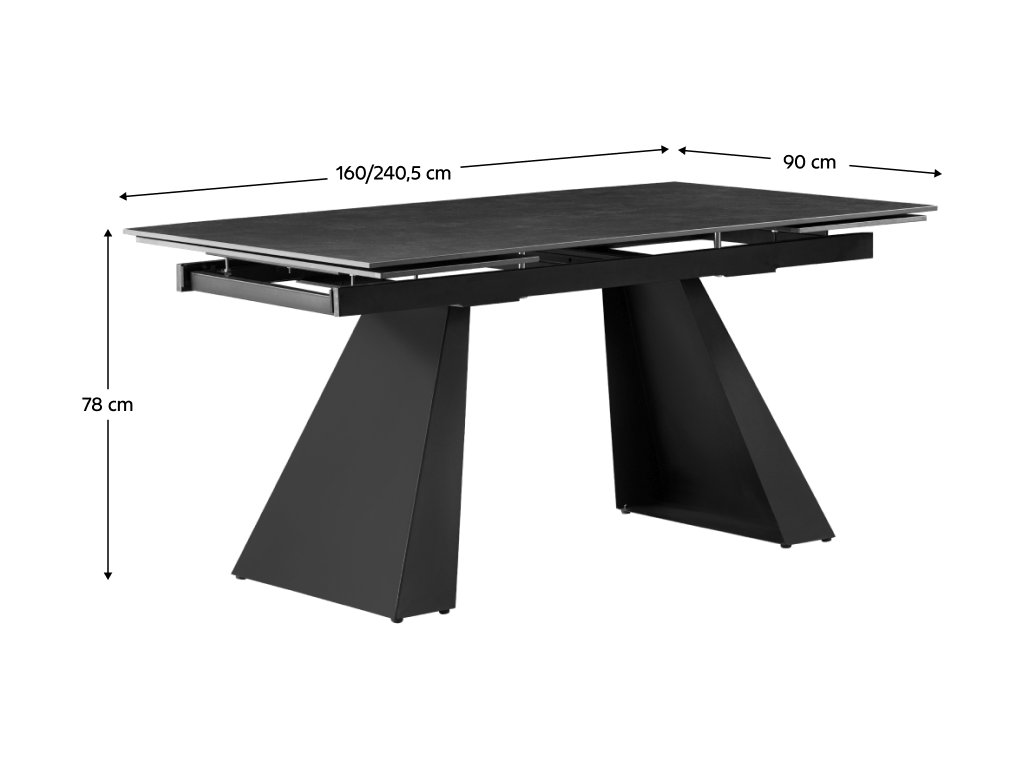 Materiál deska stolu: keramika Barva: grafit Konstrukce nohy: kov Barva: černá Rozměry (ŠxHxV): 160-240,5x90x78 cm Tloušťka materiálu vrchní desky: 1,2 cm Praktický Vhodný pro 6-8 osob Nosnost: 25 Kg Dodáváno v demontu