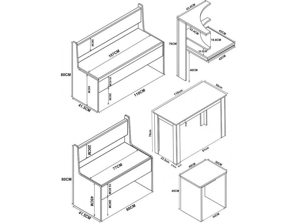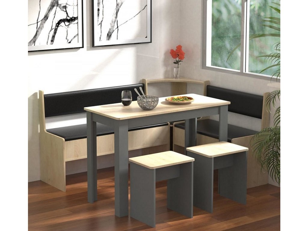 Dvě lavice s úložným prostorem a kompaktní stůl zajišťují maximální využití prostoru bez kompromisů na pohodlí. Díky variabilní montáži lze sestavu přizpůsobit libovolně do levého nebo pravého rohu.