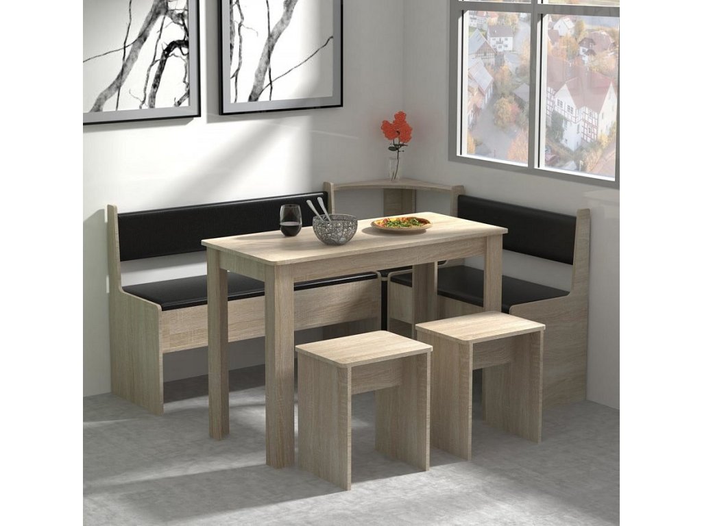 Dvě lavice s úložným prostorem a kompaktní stůl zajišťují maximální využití prostoru bez kompromisů na pohodlí. Díky variabilní montáži lze sestavu přizpůsobit libovolně do levého nebo pravého rohu.