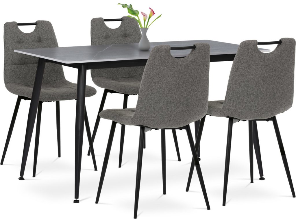 Moderní jídelní set Autronic přináší dokonalou kombinaci elegance a funkčnosti. Obdélníkový stůl s deskou ze slinuté keramiky v imitaci šedého mramoru dodá jídelně luxusní nádech, zatímco stabilní kovové nohy v černém provedení zajistí pevnost a odolnost. Čtyři pohodlné židle čalouněné šedou látkou s měkkým polstrováním zaručují maximální komfort při sezení. Stylový detail v podobě černého madla na opěradle usnadňuje manipulaci. Ideální volba pro moderní interiéry, kde se snoubí praktičnost s nadčasovým designem.