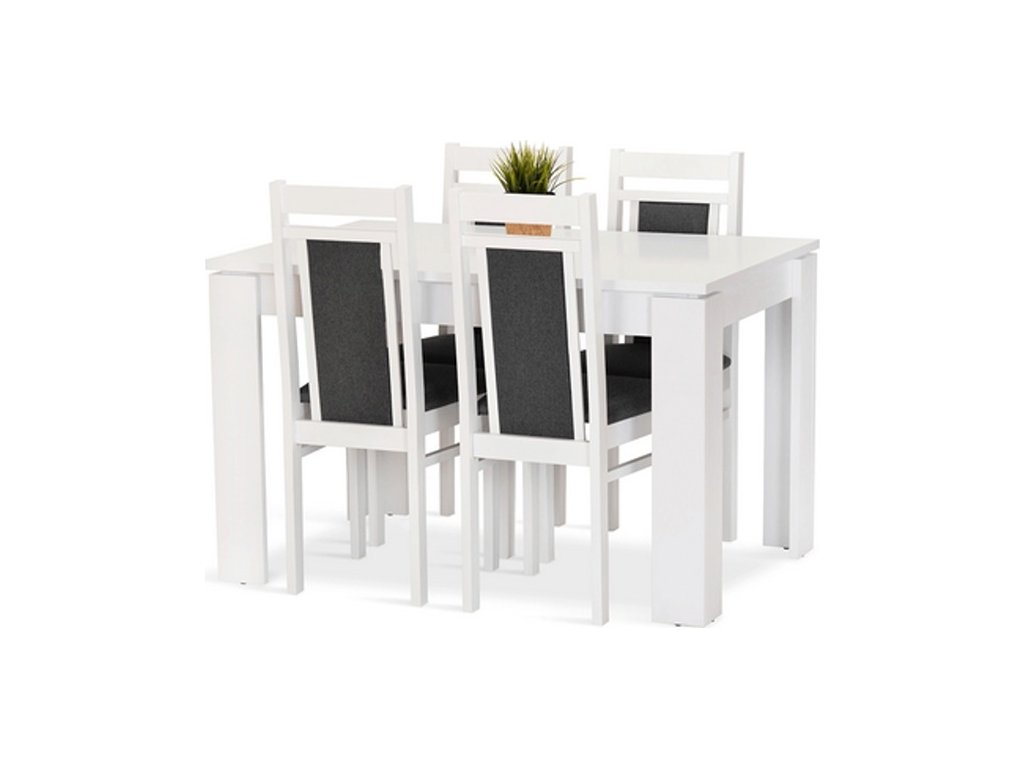 Jídelní sestava Akord 4 se skládá ze stolu a čtyř židlí. Tato jídelní sestava splní svůj účel na výbornou nejen v kuchyni, ale i v jídelně, nebo obývacím pokoji s jídelním koutem. Svou vysokou kvalitou a precizním zpracováním, uspokojí všechny budoucí, i ty velmi náročné, uživatele. Stůl je vyrobený z bílého matného lamina tl.22 mm, kostry židlí z bukového dřeva, barveného na bílou barvu. Jídelní sestava je dodávaná v demontu. Součástí balení je schématický montážní návod, včetně všech potřebných spojovacích prvků. Cena je uvedena za jídelní stůl a 4 židle. Úvodní fotografie je ilustrační. Židle budou dodané v modré barvě.