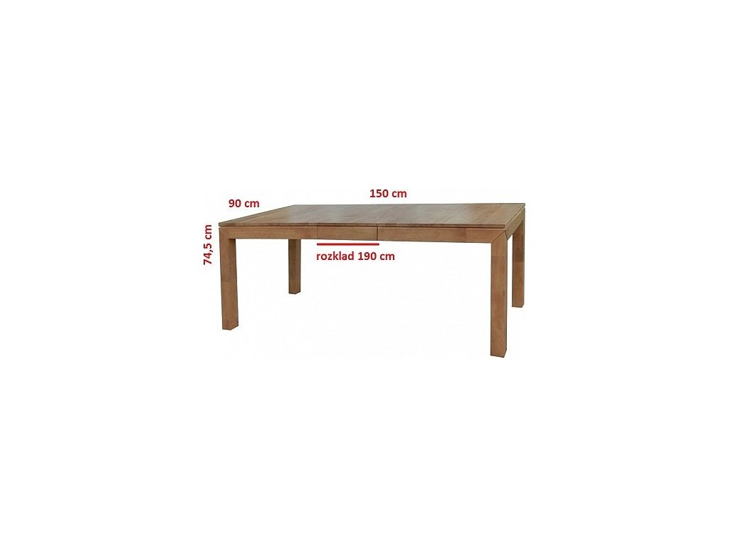 Jídelní stůl BRUNO je široký přesně 150 centimetrů s rozkladem na 190, hluboký 90 a vysoký 74,5 centimetru.