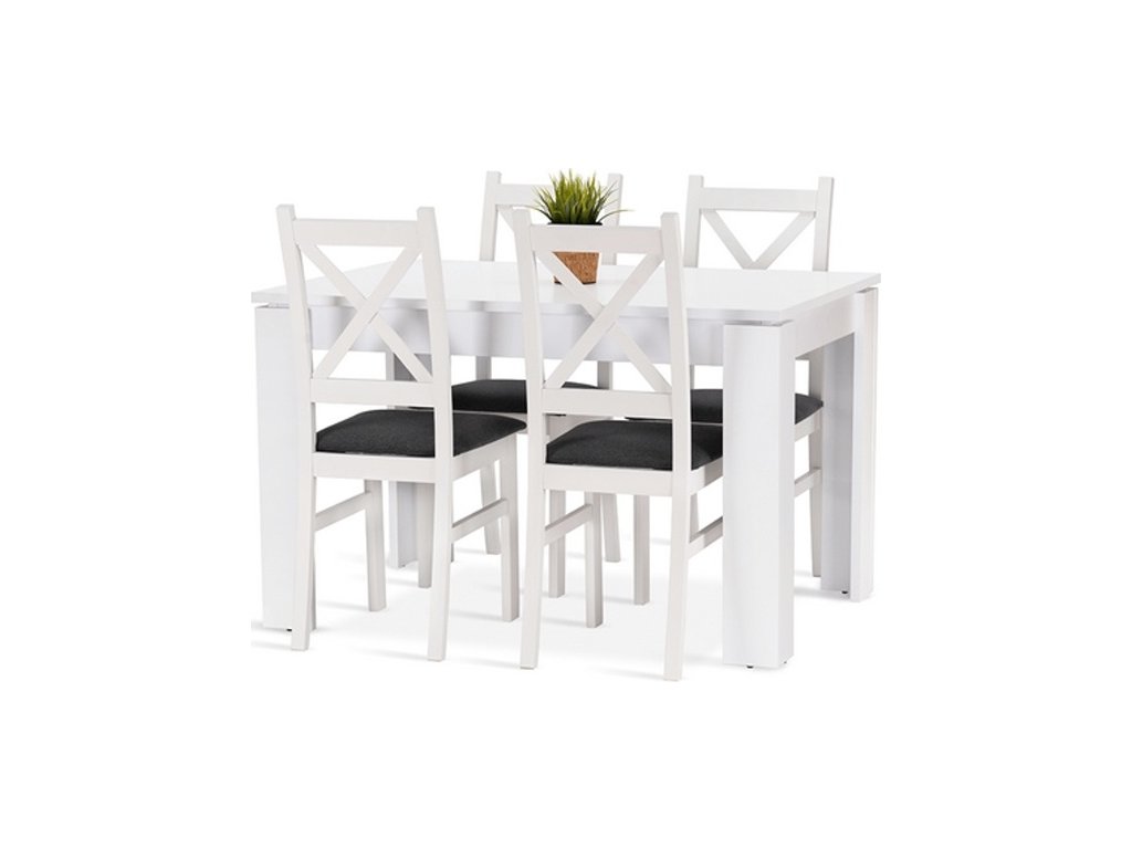Jídelní sestava Iris 4 se skládá ze stolu a čtyř židlí. Tato jídelní sestava svou vysokou kvalitou a precizním zpracováním uspokojí všechny budoucí uživatele. Stůl je vyrobený z bílého matného lamina tl.22 mm, kostry židlí z bukového dřeva, barveného na bílou barvu. Jídelní sestava je dodávaná v demontu. Součástí balení je schématický montážní návod, včetně všech potřebných spojovacích prvků. Cena je uvedena za jídelní stůl a 4 židle.
