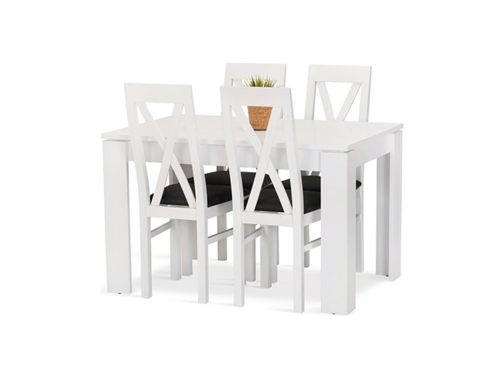 Jídelní sestava Valdo 4 se skládá ze stolu a čtyř židlí. Tato jídelní sestava splní svůj účel na výbornou nejen v kuchyni, ale i v jídelně, nebo obývacím pokoji s jídelním koutem. Svou vysokou kvalitou a precizním zpracováním, uspokojí všechny budoucí, i ty velmi náročné, uživatele. Stůl je vyrobený z bílého matného lamina tl.22 mm, kostry židlí z bukového dřeva, barveného na bílou barvu. Jídelní sestava je dodávaná v demontu. Součástí balení je schématický montážní návod, včetně všech potřebných spojovacích prvků. Cena je uvedena za jídelní stůl a 4 židle.