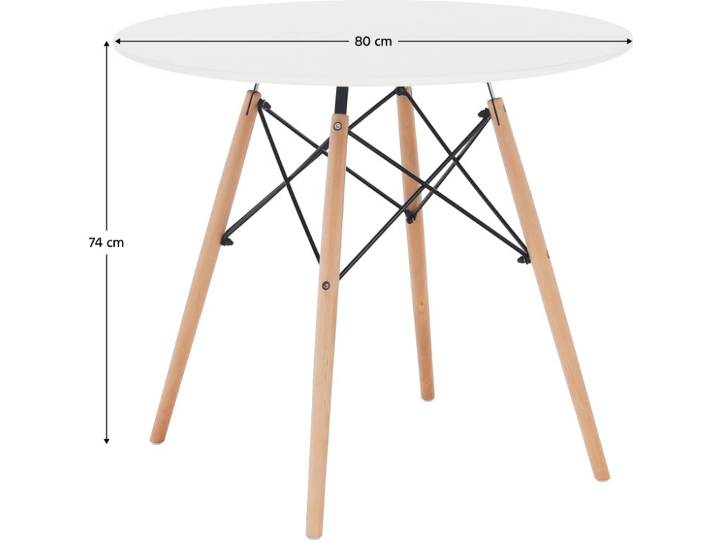 Jedálenský stôl, materiál: MDF, drevo, kovové nohy, farebné prevedenie: biela/nohy buk nohy, priemer x V: 80x74 cm.