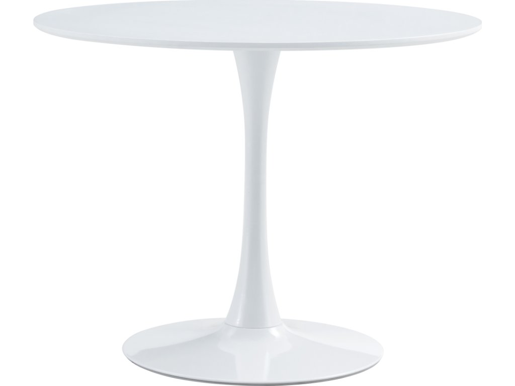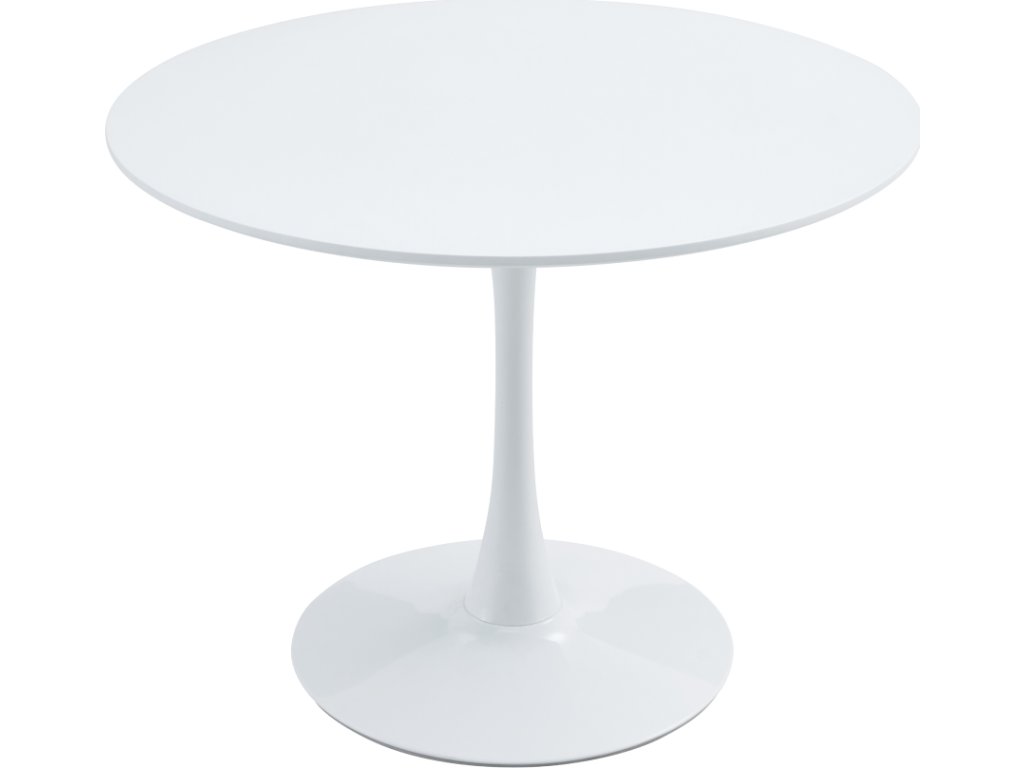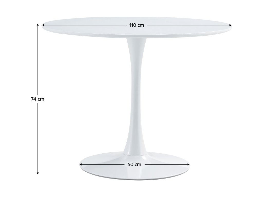 Jídelní stůl REVENTON Materiál: MDF laminovaná / kov Barva: bílá matná Rozměry (průměr x V): 110x74 cm Tloušťka plátu stolu: 1,8 cm Průměr podstavy: 50 cm moderní design kulatý Dodávané v demontu.