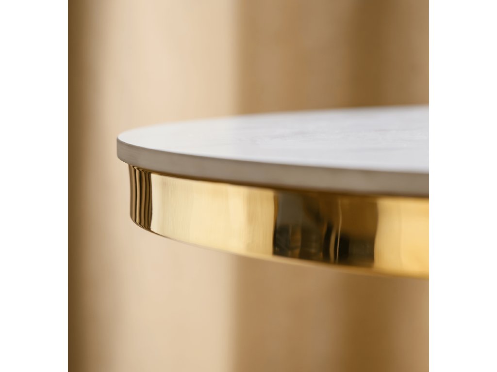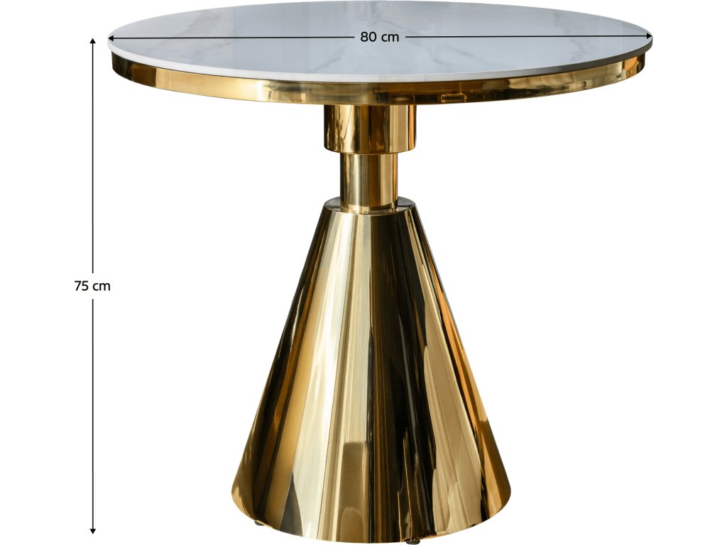 Materiál: kámen/ocel Barva: bílý mramor/zlatá Rozměry (PxV): 80x75 cm Tloušťka kamenného platu: 1,1 cm Nosnost: 50 kg Originální kousek Kulatý Moderní a stylový Dodáváno v demontu