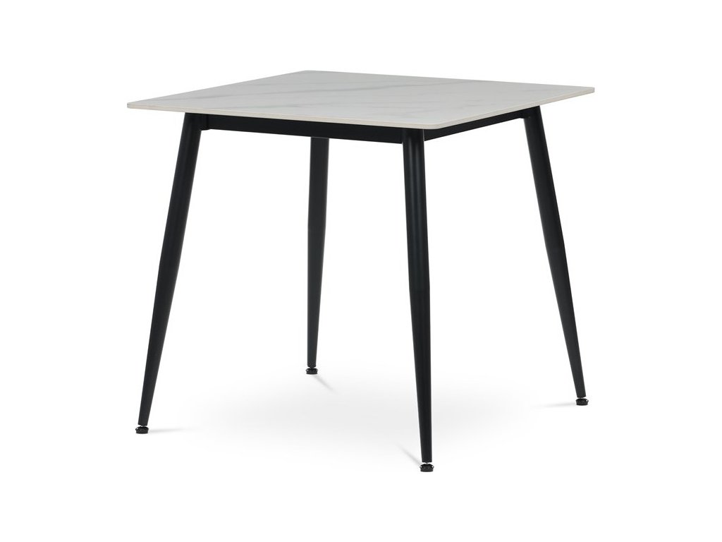 Jídelní stůl o rozměru 80x80 cm z kolekce Autronic nabízí moderní kombinaci bílé keramické desky s mramorovým dekorem a černých kovových nohou. Deska je vyrobena z matné keramiky, která je odolná vůči poškrábání a snadno se udržuje, což zajišťuje dlouhodobou estetiku i funkčnost. Stabilní kovové nohy s práškovým lakem doplňují design a jsou vybaveny rektifikačními patkami pro vyrovnání nerovností podlahy, což zvyšuje stabilitu stolu. Čtvercový tvar a kompaktní rozměr stolu jej předurčují pro menší jídelní prostory či kuchyně, kde je kladen důraz na praktičnost a styl. Nosnost stolu odpovídá běžnému domácímu použití, přičemž jeho konstrukce je navržena pro dlouhou životnost.