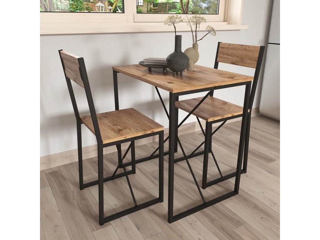 Díky možnosti zasunutí obou židlí pod stůl šetří místo, a proto je ideální jako nábytek do jídelny v bytech či menších kuchyních. Kombinace kovové konstrukce a dřevěného dekoru dodává soupravě moderní industriální vzhled a zároveň zajišťuje stabilitu.