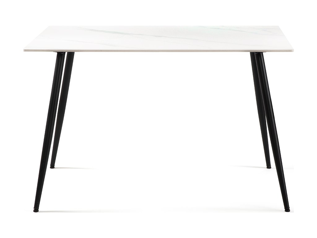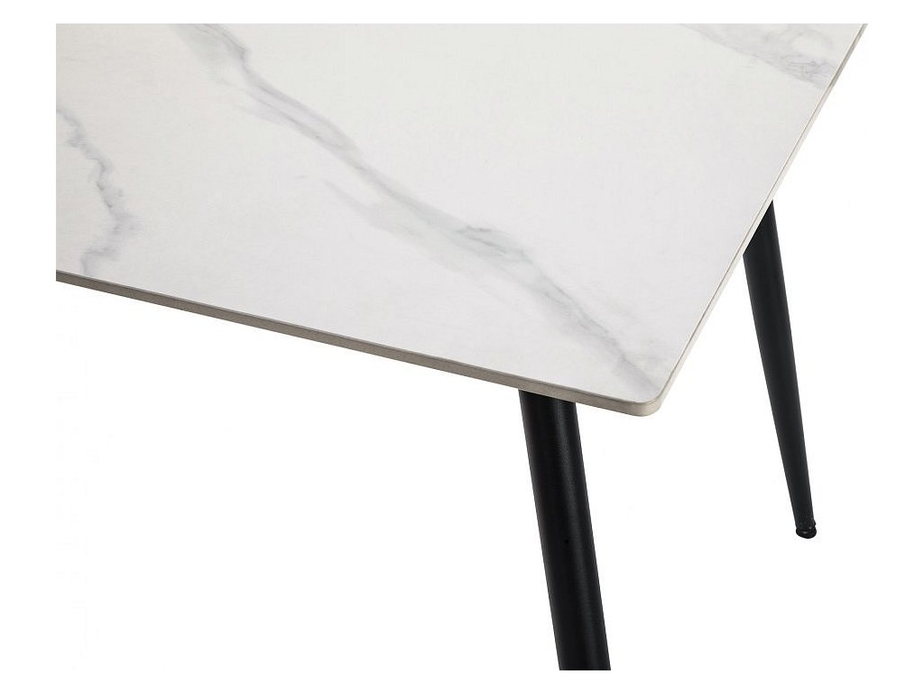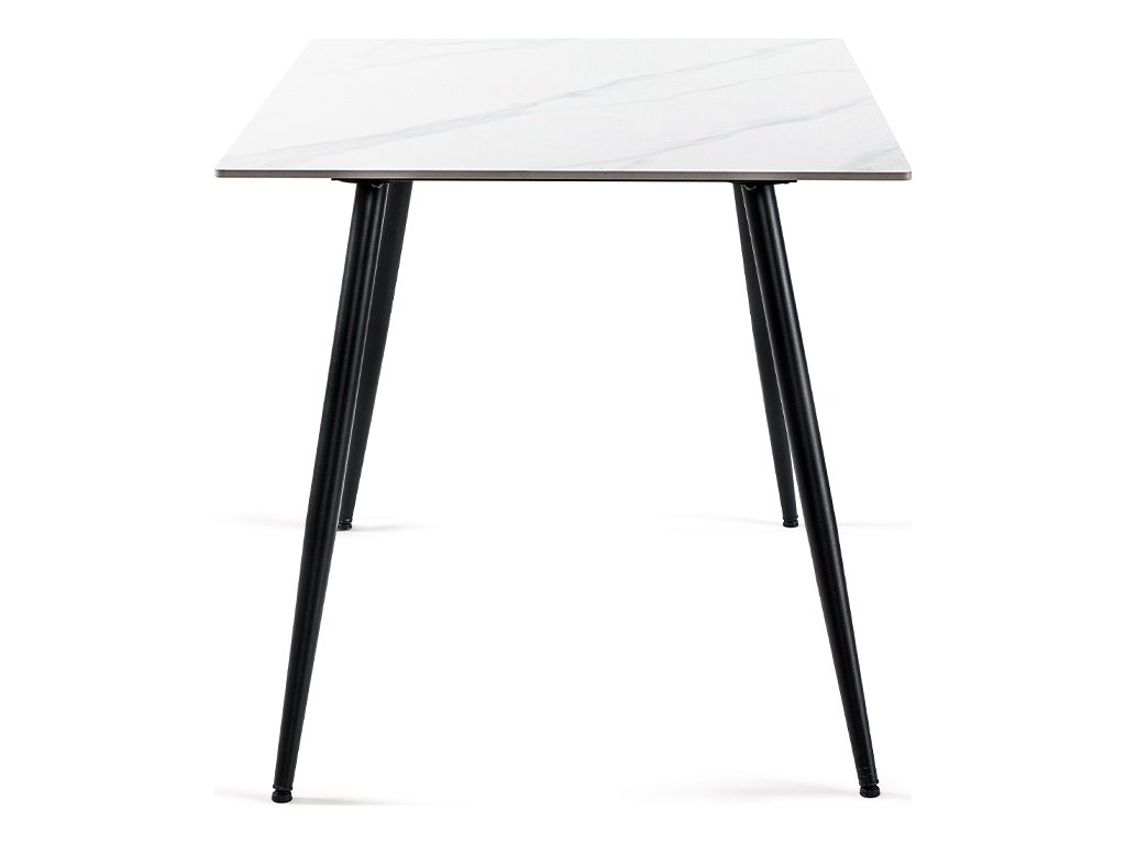 Keramická deska v bílé barvě s mramorovým dekorem s ocelovými nohy v barvě černé .