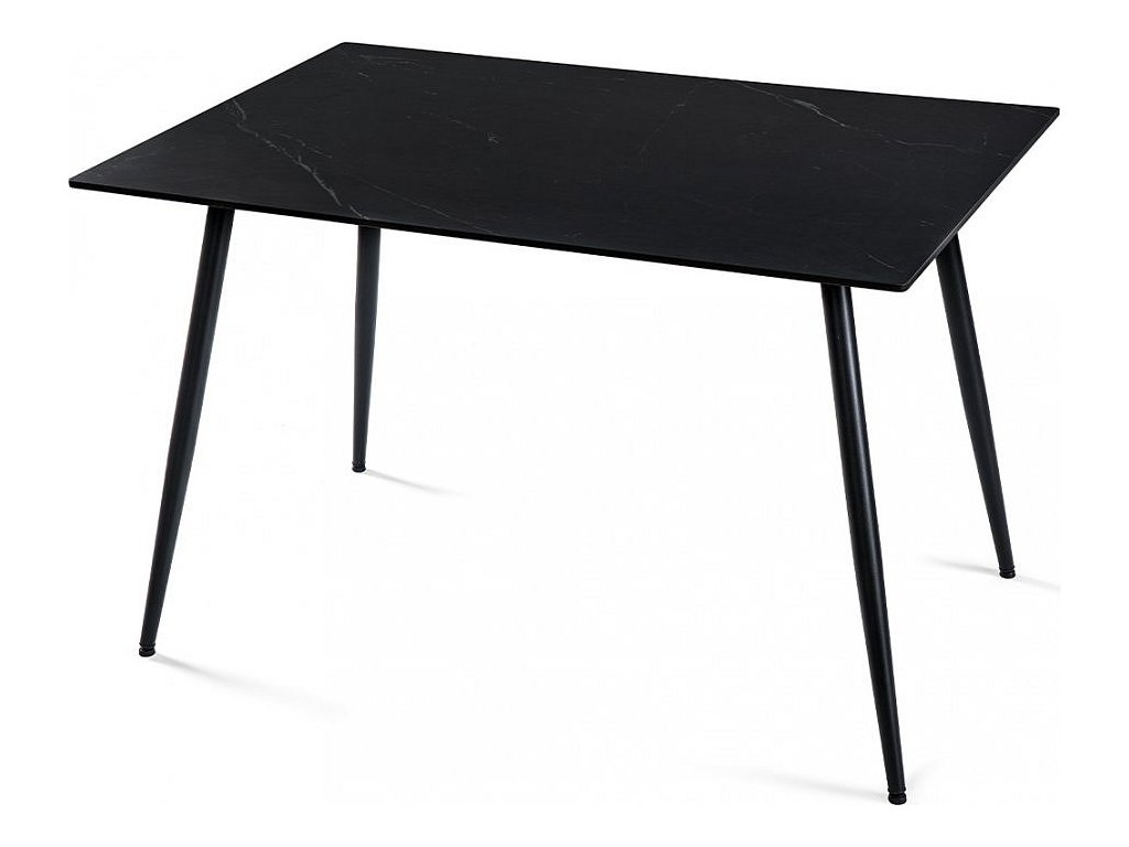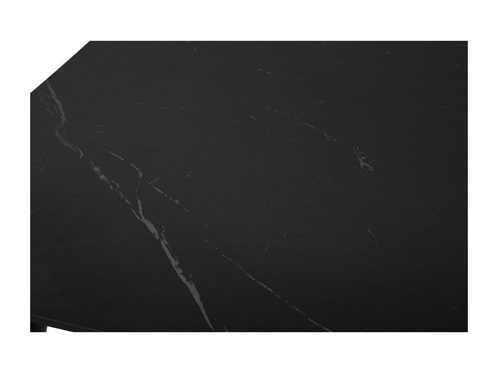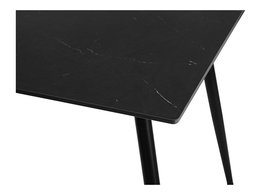 Elegantní jídelní stůl s moderním minimalistickým designem. Deska v černé barvě s mramorovým dekorem působí luxusně a nadčasově. Stabilní kovové nohy v černém provedení. Vhodný do jídelny, kuchyně i menších interiérů. Spojuje praktičnost, odolnost a stylový vzhled.