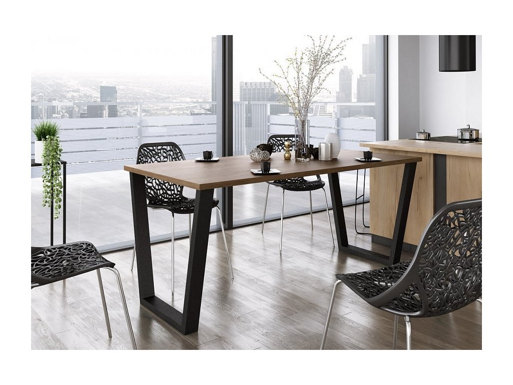 CASA 87019 Jídelní stůl je vyroben v jednoduchém industriálním, stylovém a zároveň i moderním designu. Stolová deska je vyrobena z lamina tl.28 mm v barvě dub lancelot, kovové nohy jsou práškově lakované v černé barvě (profil nohy 80x40 mm). Tyto jídelní stoly nabízíme v různých rozměrech a barvách. Dodáváme v demontovaném stavu.