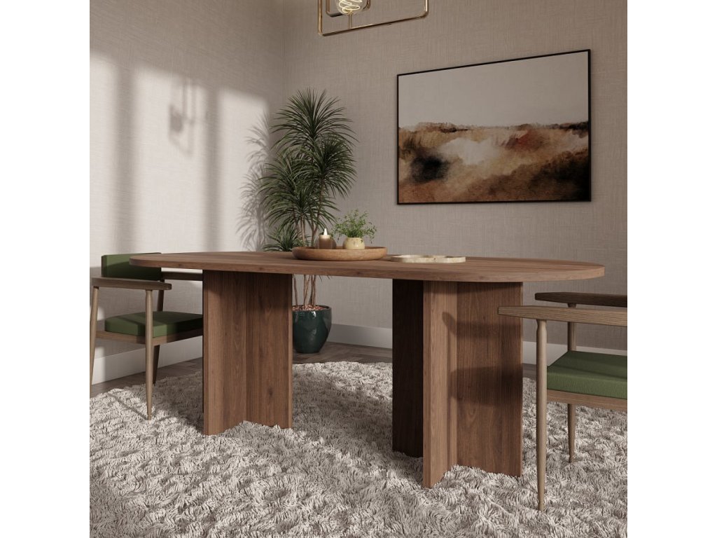 Jídelní stůl Loan kombinuje nadčasový vzhled, propracované detaily a stabilní konstrukci. Díky rozměrům desky 204 x 90 cm nabízí prostorné zázemí pro každodenní stolování i delší společně strávené chvíle. Teplé tóny dekoru ořechu přirozeně dotváří příjemnou a harmonickou atmosféru domova.