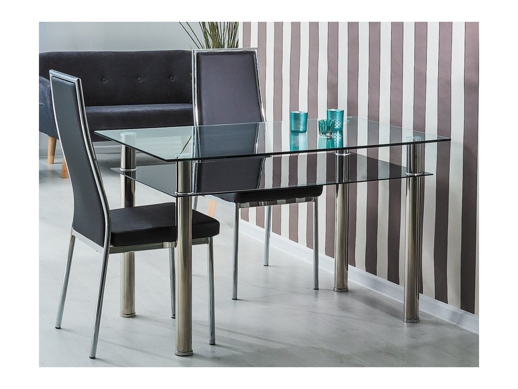 CASA 11471 Moderní jídelní stůl v elegantním a praktickém provedení. Stůl je svými rozměry vhodný i do těch nejmenších interiérů. Nohy stolu jsou vyrobeny z pochromovaného kovu, deska i spodní odkládací polička jsou z tvrzeného skla. K tomuto stolu doporučujeme židle z naší nabídky. Dodáváme v demontovaném stavu.