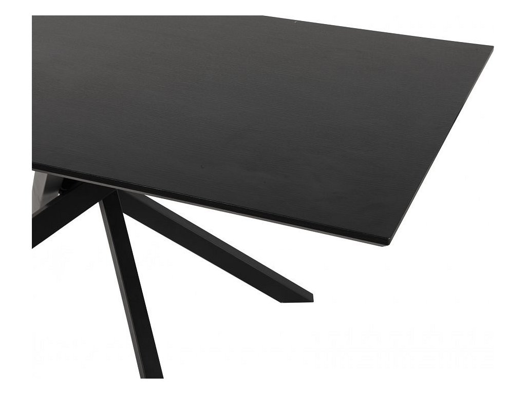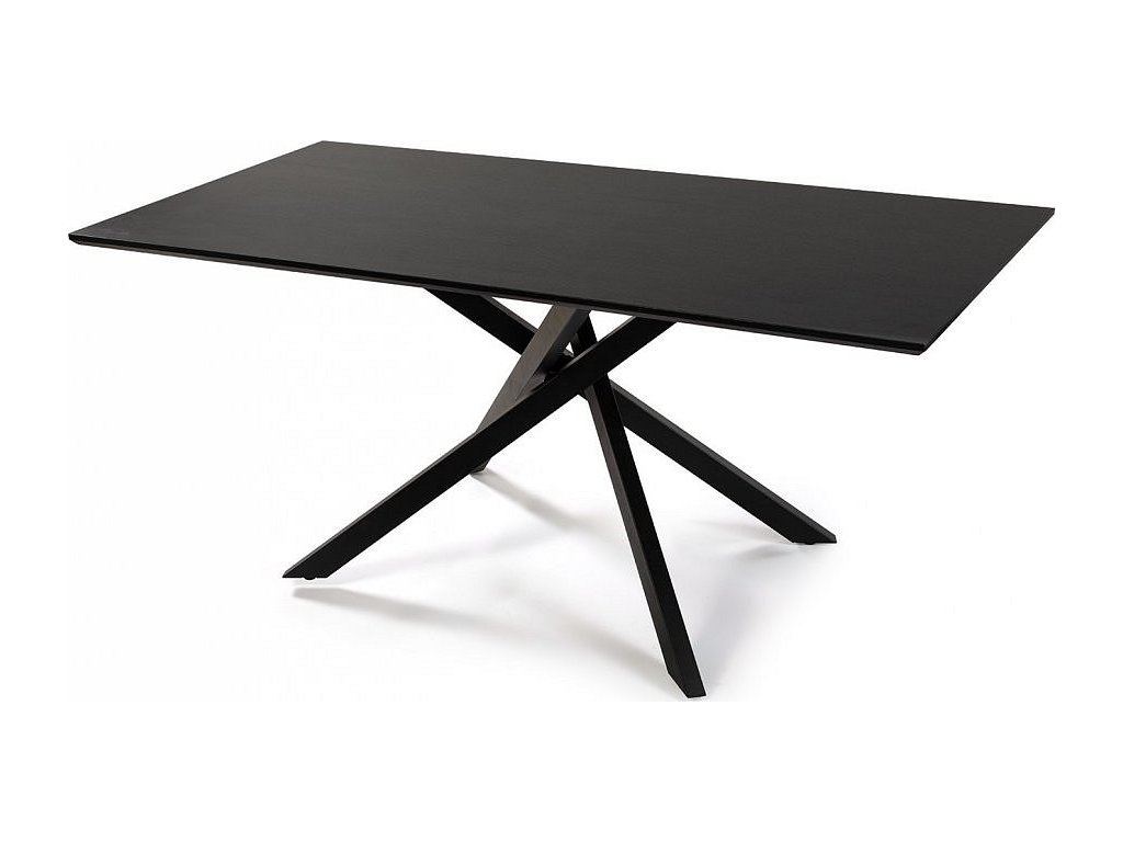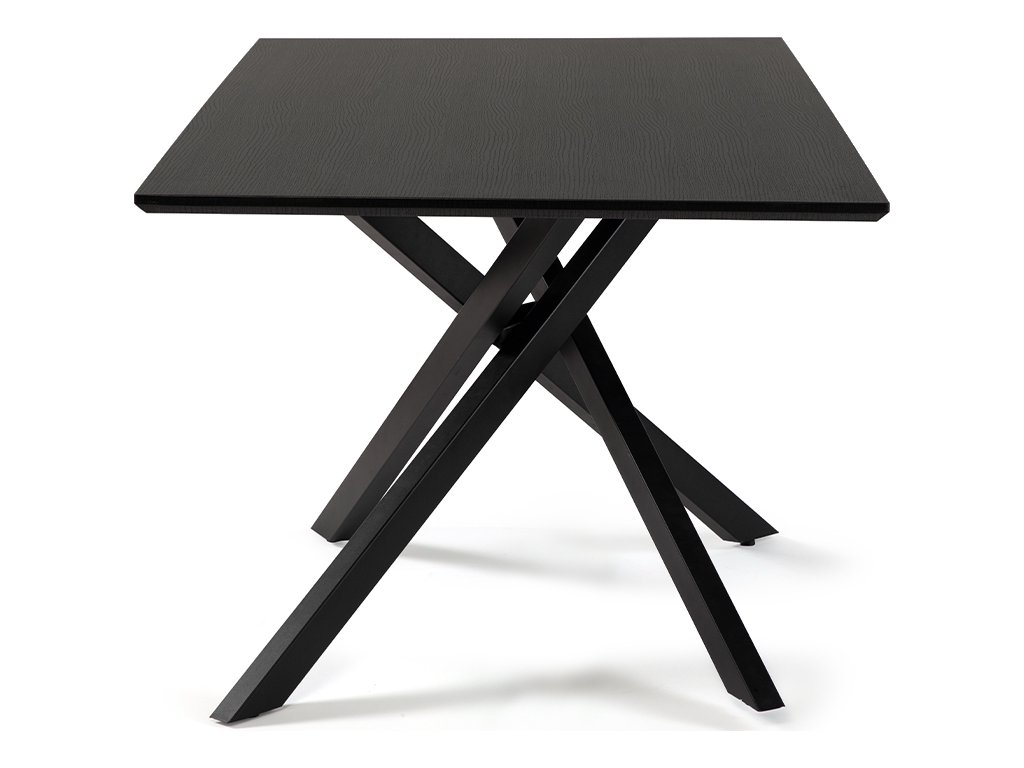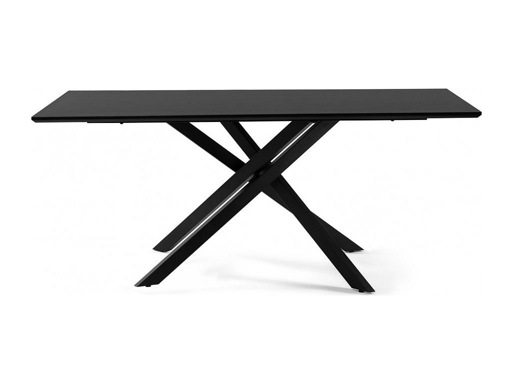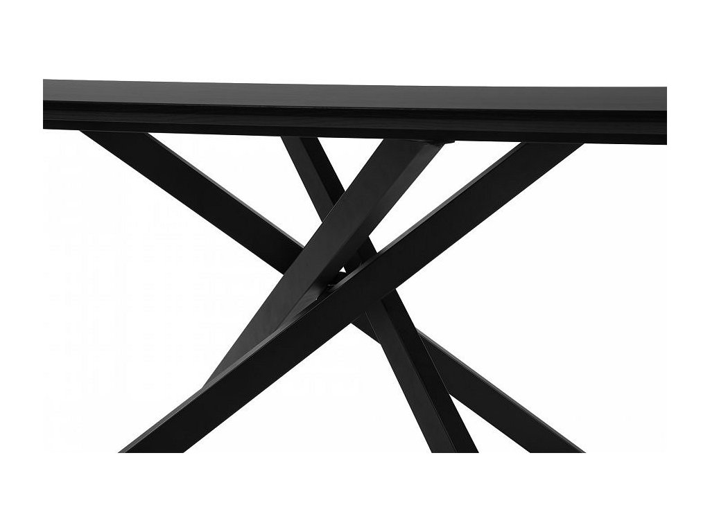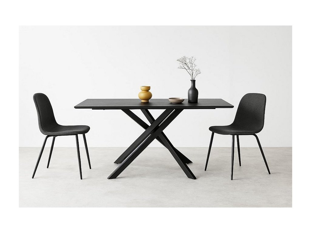 Obdélníkový jídelní stůl s výrazným moderním designem. Černá stolová deska dodává interiéru elegantní a luxusní vzhled. Stabilní kovová podnož s originálním křížením nohou. Vhodný do prostorné jídelny či moderní kuchyně. Spojuje praktičnost, pevnost a stylovou eleganci.