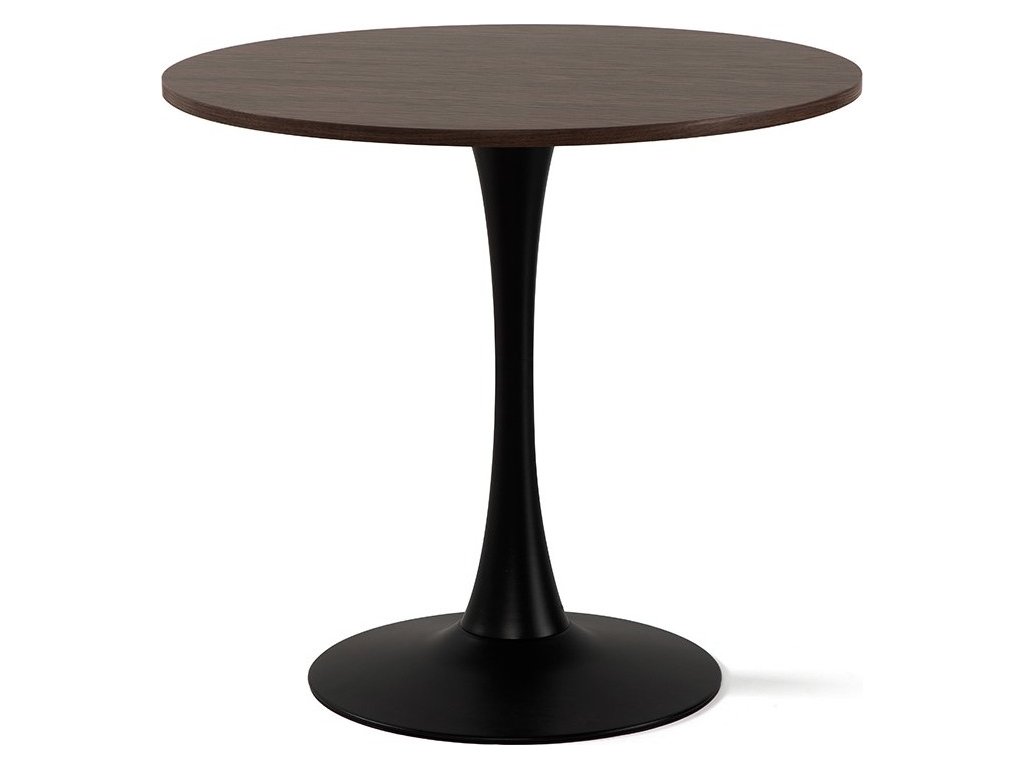 Kulatá MDF deska v dekoru tmavého dřeva dodává interiéru teplo, zatímco centrální kovová noha v černém matném provedení zajišťuje stabilitu a moderní vzhled.