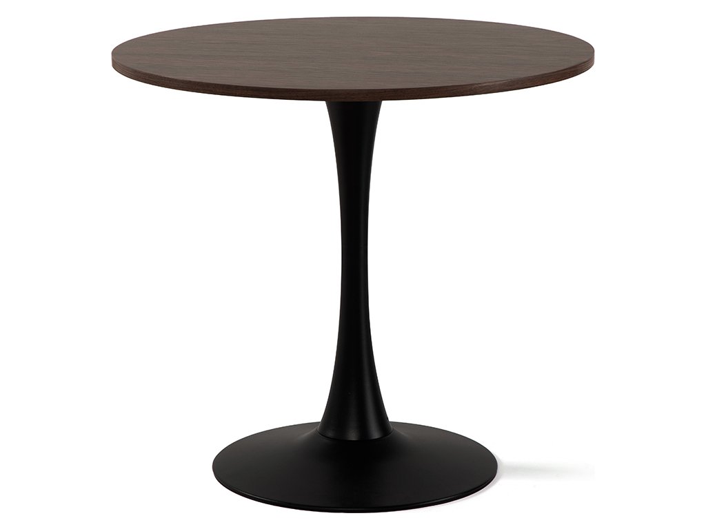 Stolová MDF deska s texturou dřeva v hnědé barvě o průměru 80cm, práškované ocelové podnoží.