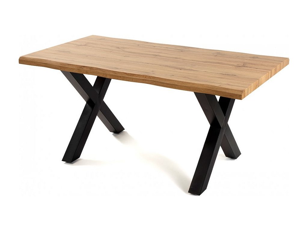 Deska v přírodním dekoru dřeva s krásně viditelnou kresbou působí hřejivě a útulně, zatímco robustní kovová podnož ve tvaru písmene X dodává stolu pevnost a charakter.