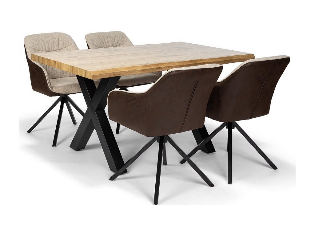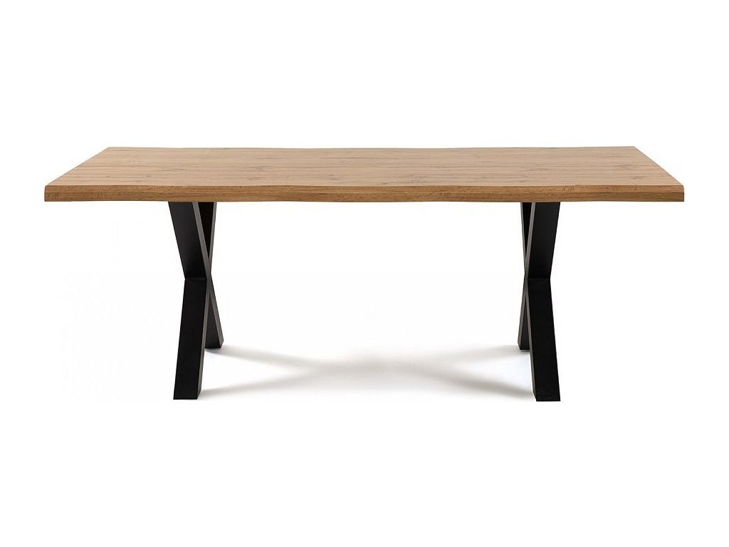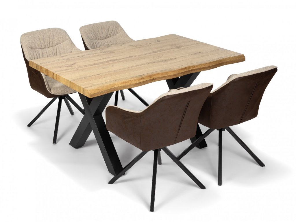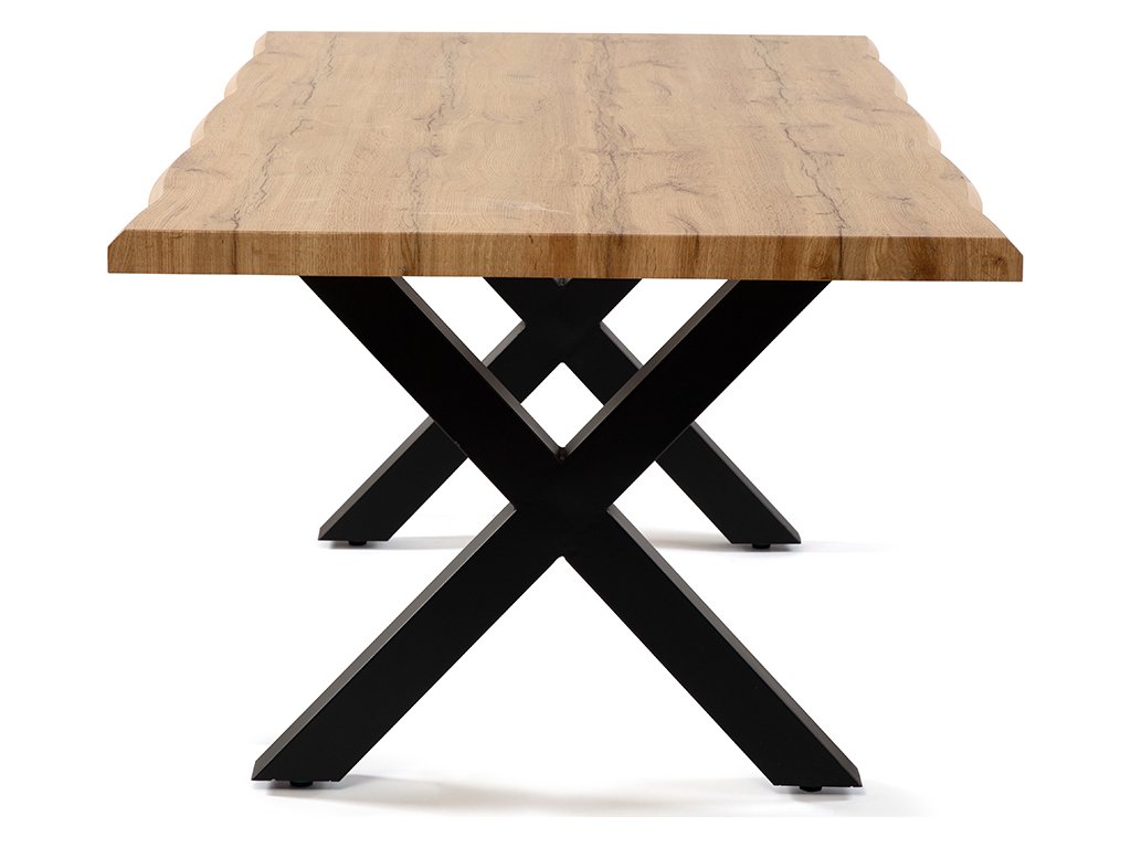 Jídelní stůl s designovou dřevěnou deskou a přírodními hranami. Ochranná 3D fólie. Práškované ocelové podnoží v černé barvě. Komfortní prostor po stranách pro 4 osoby + 2 k čelu stolu.