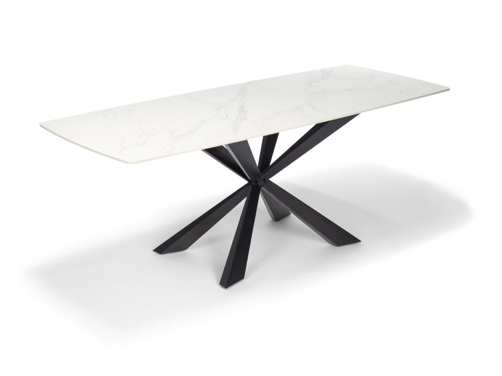 Tento jídelní set představuje dokonalou rovnováhu mezi moderní estetikou a každodenním komfortem. Dominantou je prostorný stůl s elegantní deskou v dekoru bílého mramoru, která působí čistě, luxusně a zároveň nadčasově. Stabilní podnož v černém provedení dodává celku vizuální kontrast a pevnost.