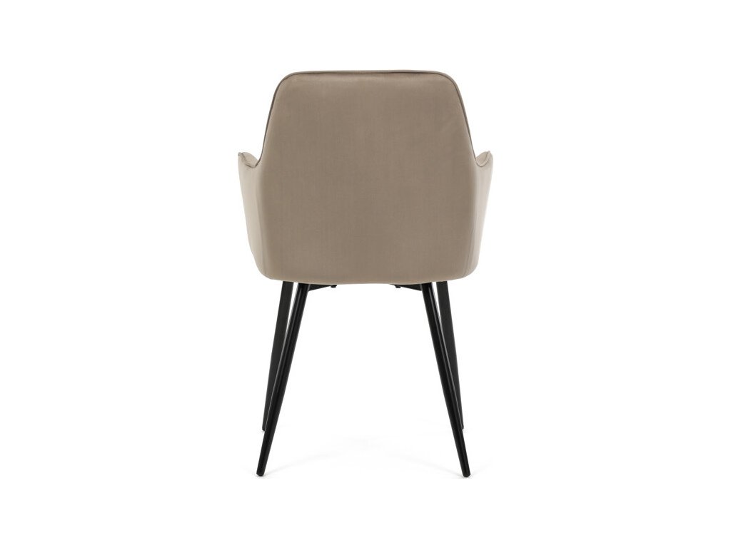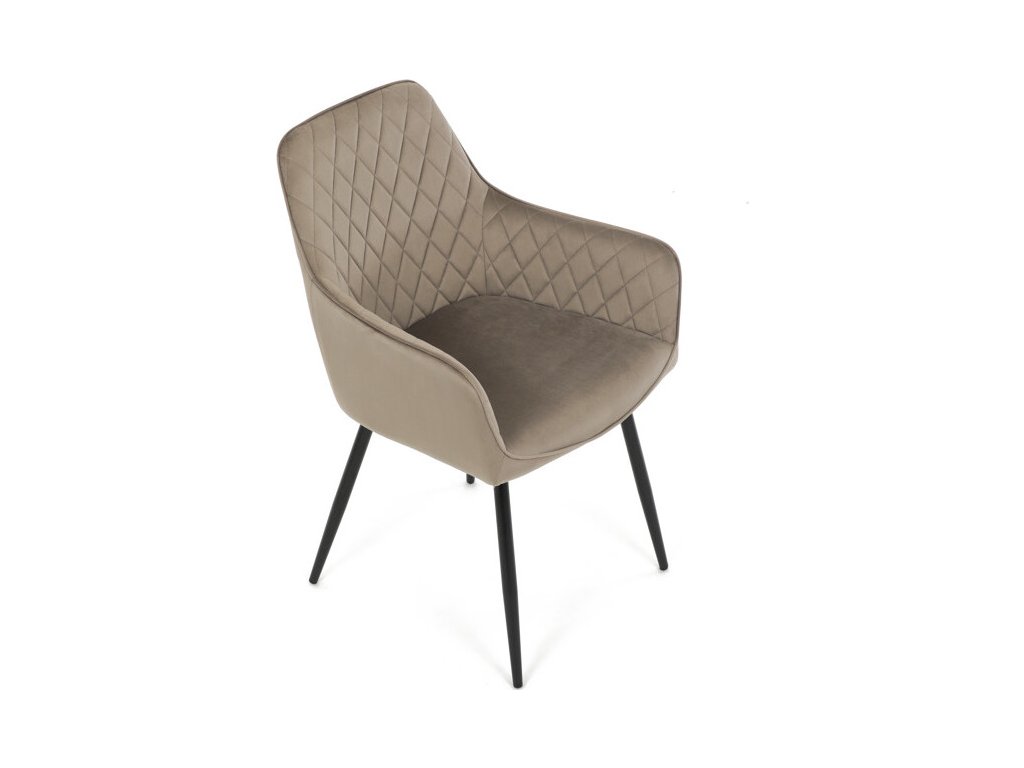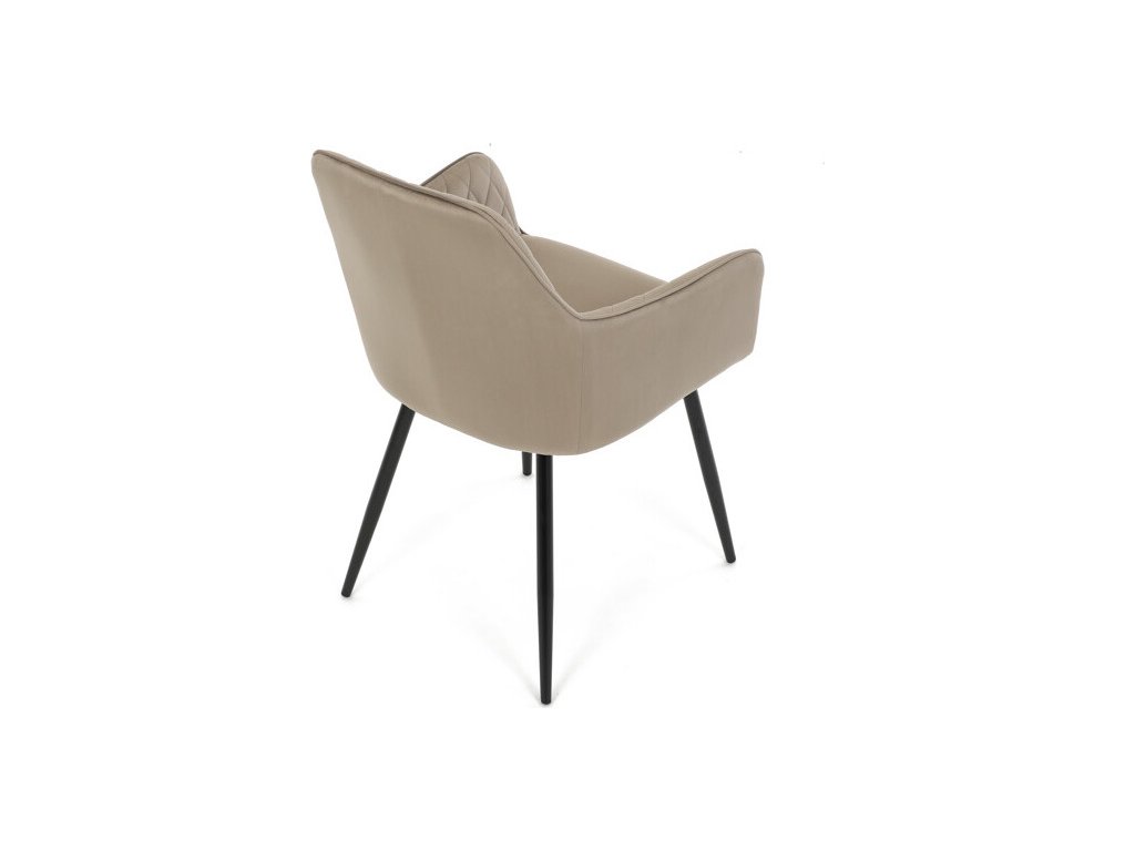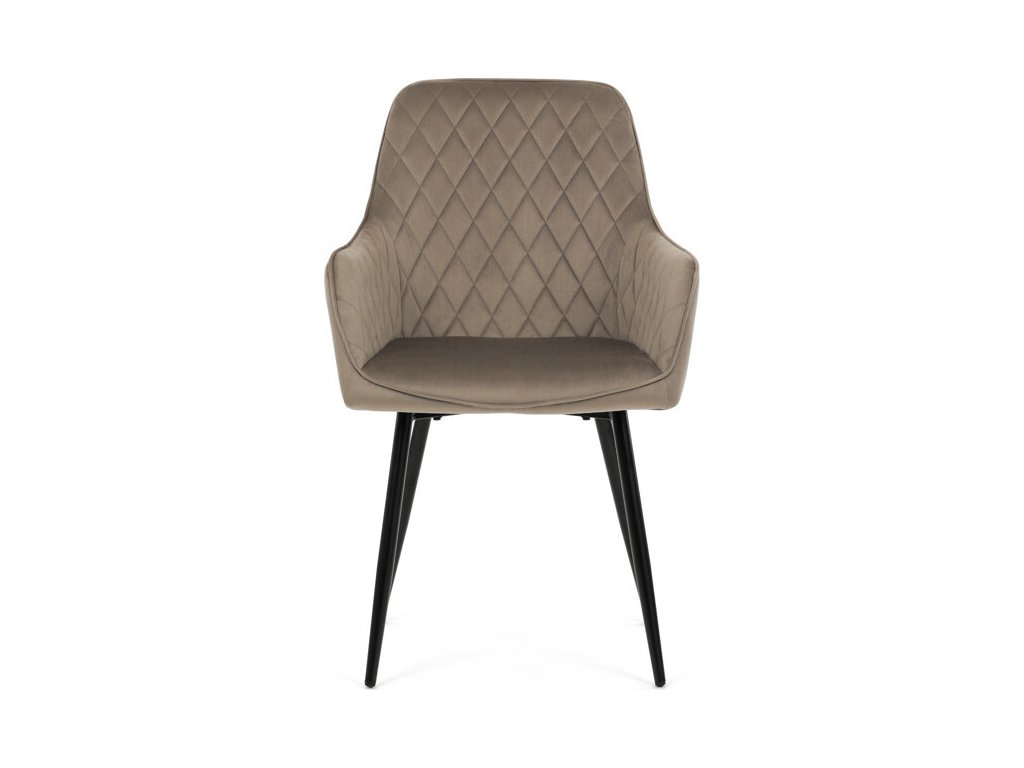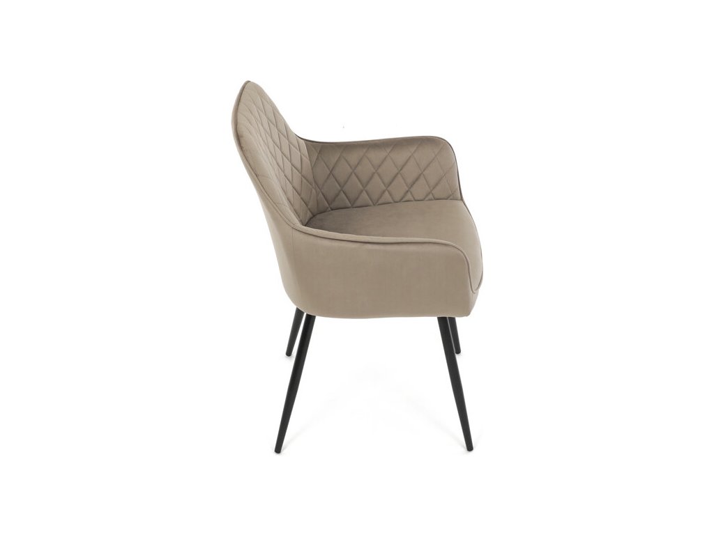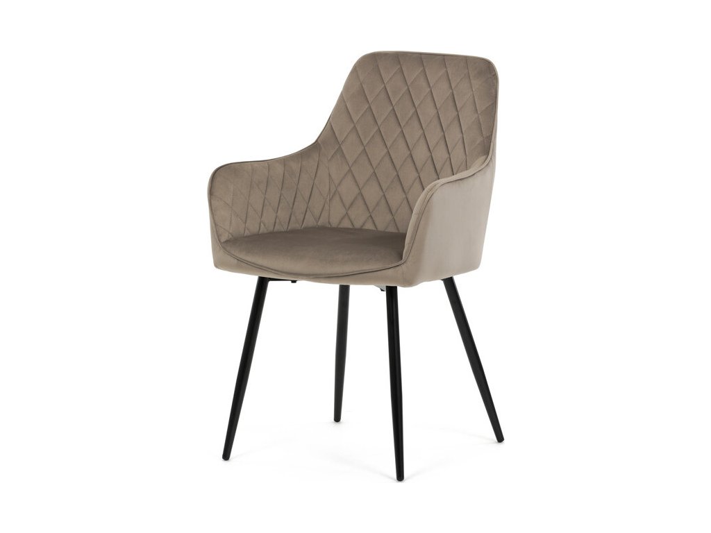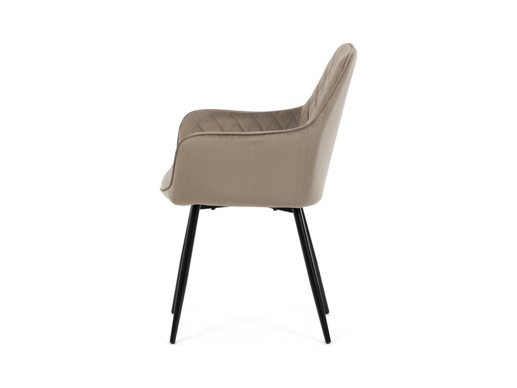 Jídelní židle s označením DCH-215 CAP4 nabízí komfortní sezení díky čalounění z jemné sametové látky v cappuccino odstínu, která je doplněna designovým prošitím v kosočtverečkovém vzoru. Pevné černé kovové nohy zajišťují stabilitu a dlouhou životnost, zatímco integrované područky přispívají k pohodlí při sezení. Sedák i opěradlo jsou ergonomicky tvarované pro podporu správného držení těla během jídla nebo odpočinku. Díky kombinaci kvalitních materiálů a precizního zpracování je židle vhodná do moderních i klasických interiérů. Nosnost a přesné rozměry nejsou uvedeny, avšak konstrukce odpovídá standardům pro běžné domácí použití.