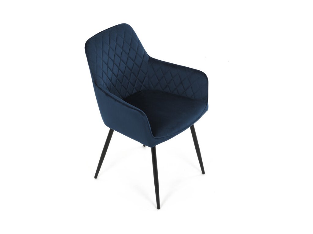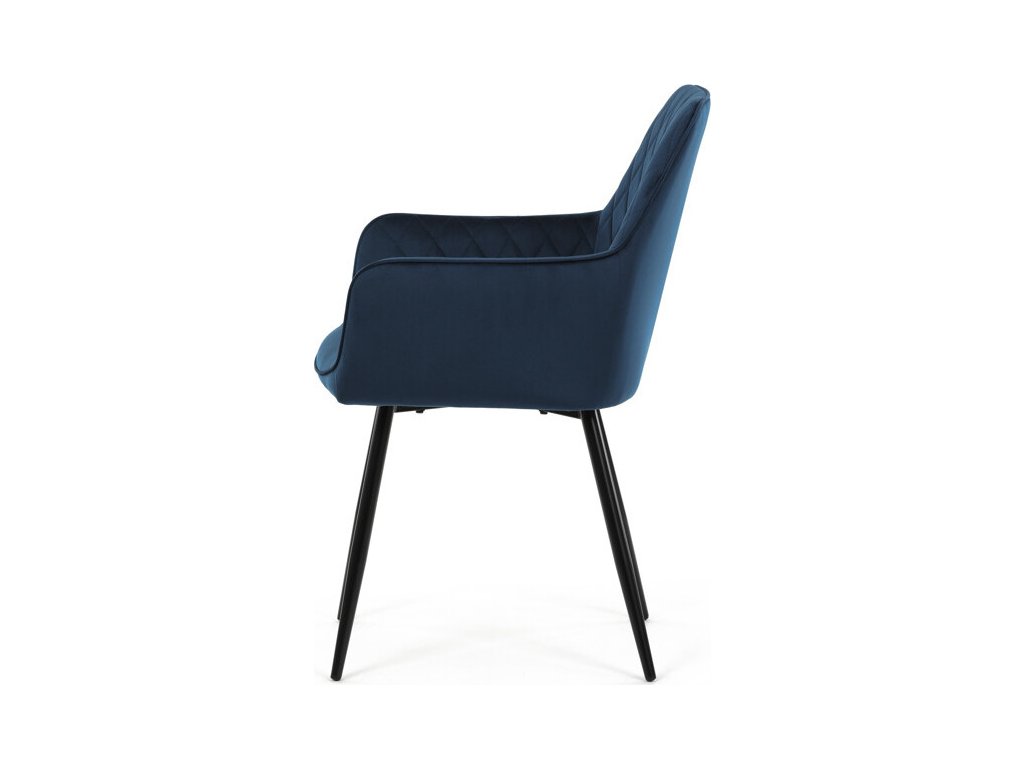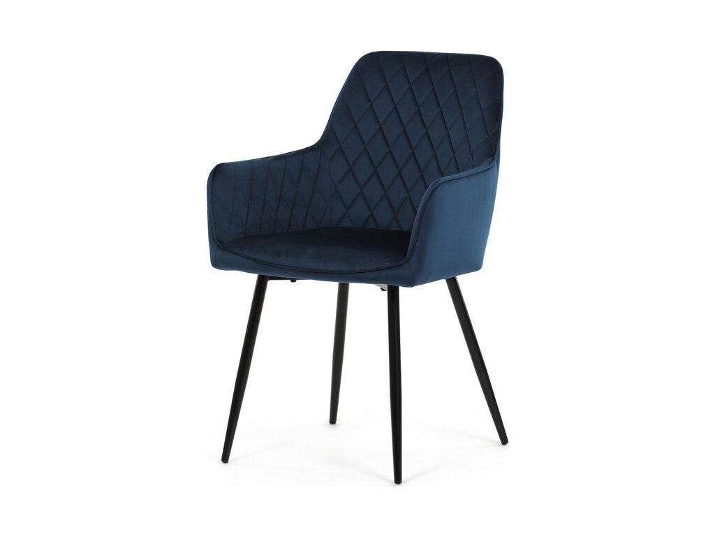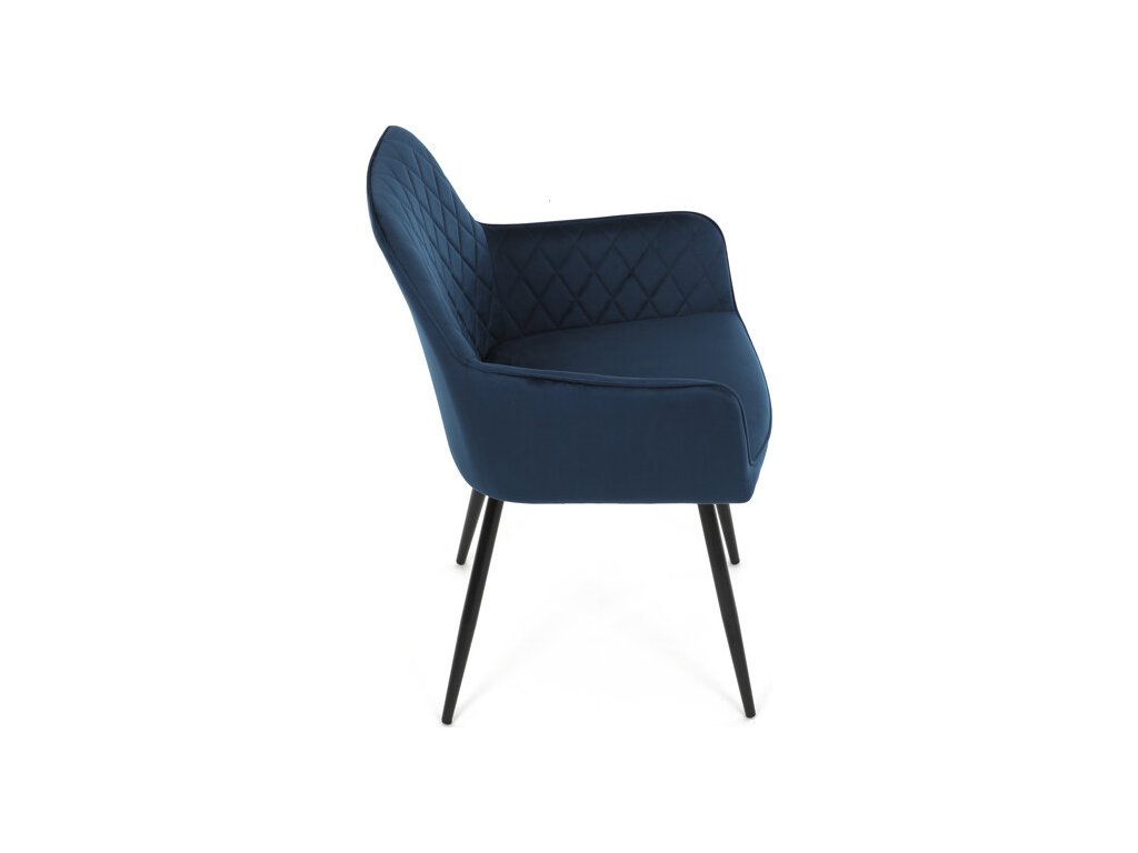 Jídelní židle DCH-215 BLUE4 s potahem z modré sametové látky nabízí příjemný dotek a vizuálně atraktivní design díky prošívání ve tvaru kosočtverců na opěradle a područkách. Pevné kovové nohy v černém matném provedení zajišťují stabilitu a dlouhou životnost. Sedák i opěradlo jsou vyplněné měkkou pěnou, která přispívá k pohodlnému posezení během delších jídel i setkání. Područky jsou integrované do tvaru židle, což podporuje ergonomii a komfort uživatele. Židle je vhodná do moderních interiérů, kde vynikne její elegantní sametový vzhled a kvalitní zpracování.