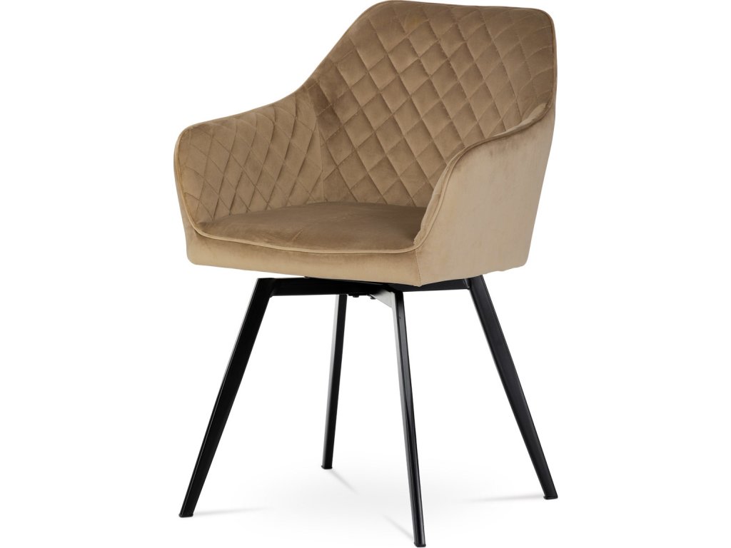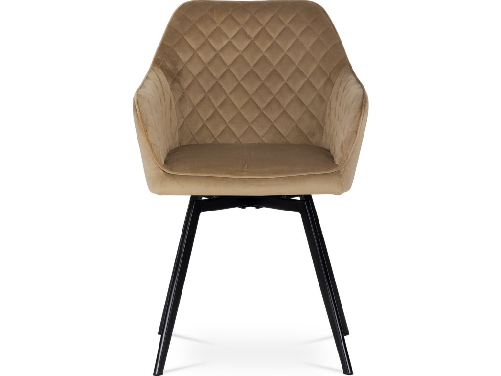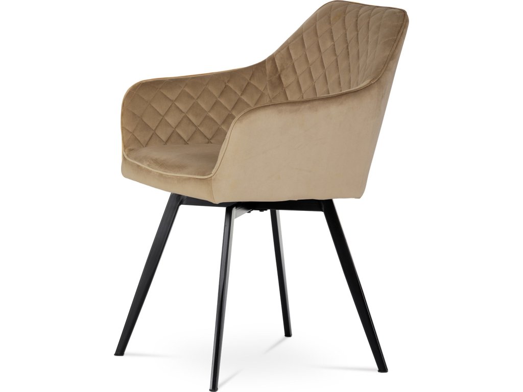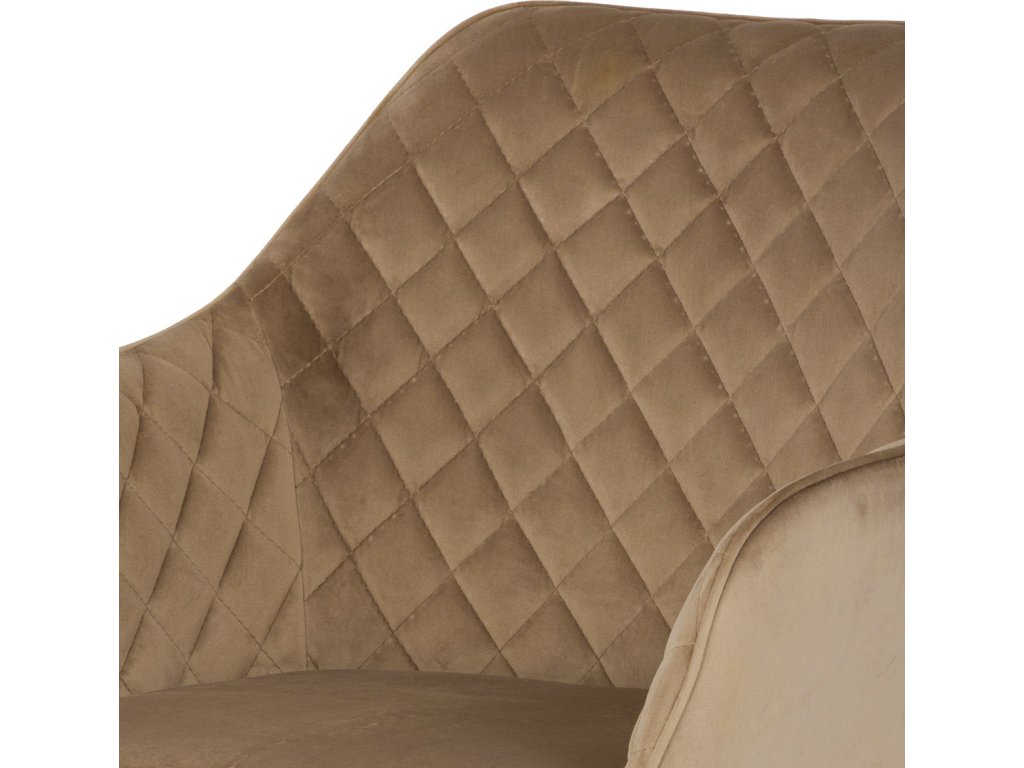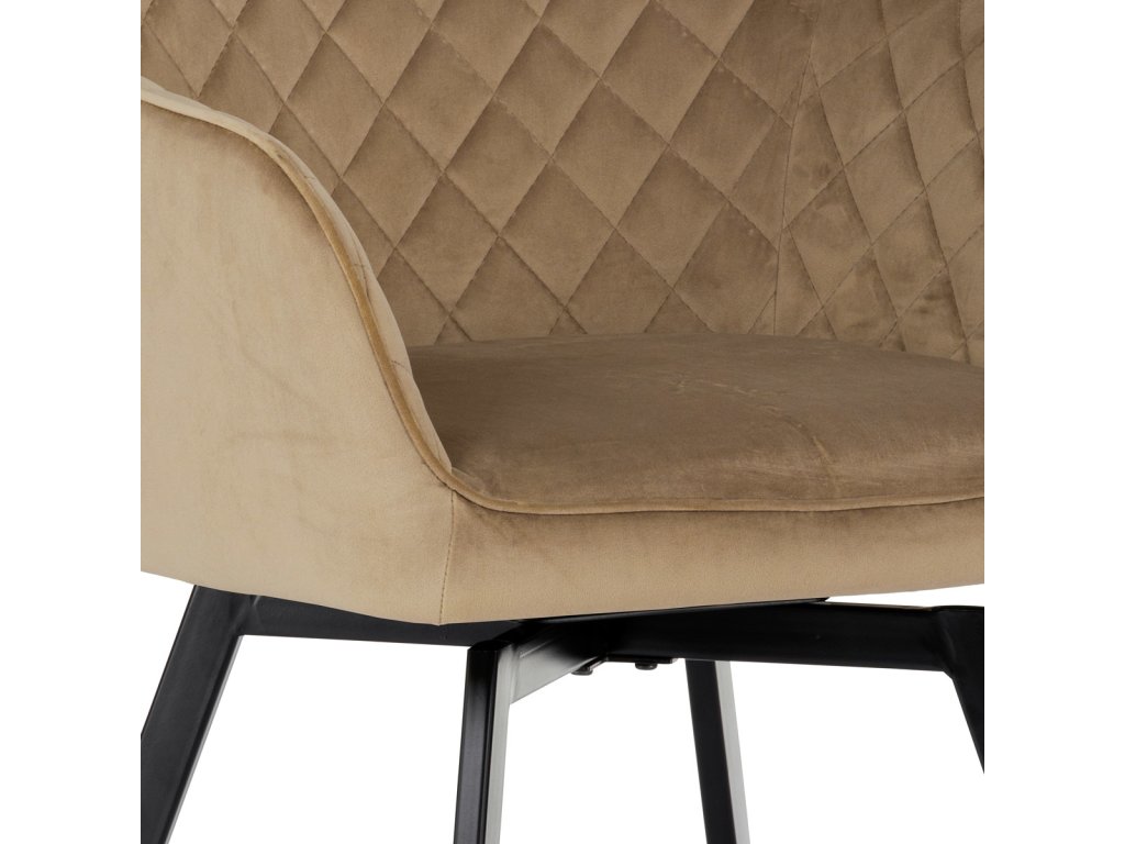 Díky svému dokonalému designu je tato židle v industriálním stylu nezaměnitelná a zároveň velmi pohodlná. Skořepina sedáku a opěradla má potah z kvalitní sametové látky v trendy odstínu zlaté cappuccino v matné úpravě. Polstrování je z PU pěny. Velmi dekorativním prvkem je výrazné kosočtvercové prošití vnitřních ploch v barvě potahu a paspule po obvodu celé skořepiny. Vybraná látka se také velmi dobře čistí. Stabilitu židle zajišťují čtyři kónické kovové nohy obdélníkového průřezu s kvalitním práškovým nástřikem v černé matné barvě. Ukončené jsou černými plastovými kluzáky, zabraňující poškození tvrdých povrchů podlah. Tato provedení produkují z tohoto modelu židle skvělou volbu pro zařízení obývacích či jídelních, ale také zasedacích místností. Nosnost židle je 110 kg. Bonusem této židle je otočný a vratným mechanismus, který umožňuje otáčení o 90° doleva a o 90° doprava a zároveň vždy vrátí sedák do původní polohy. Díky němu žiidle zůstanou vždy srovnané u stolu.