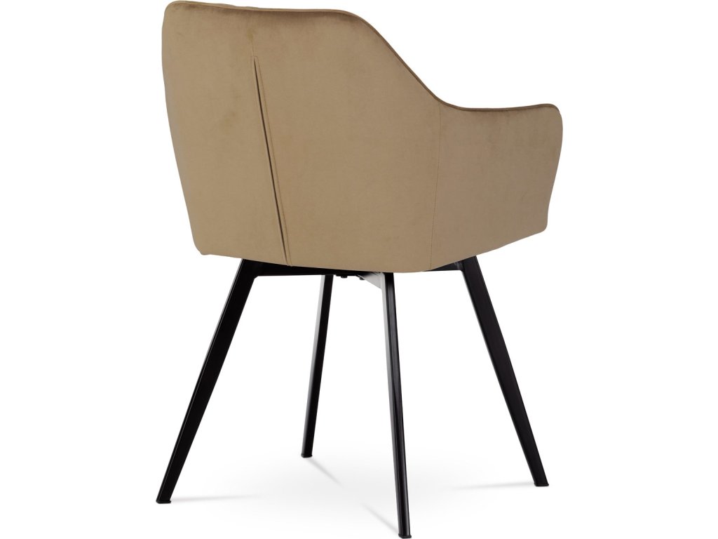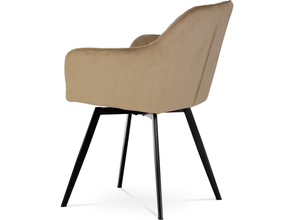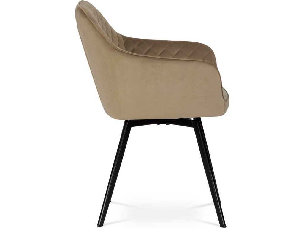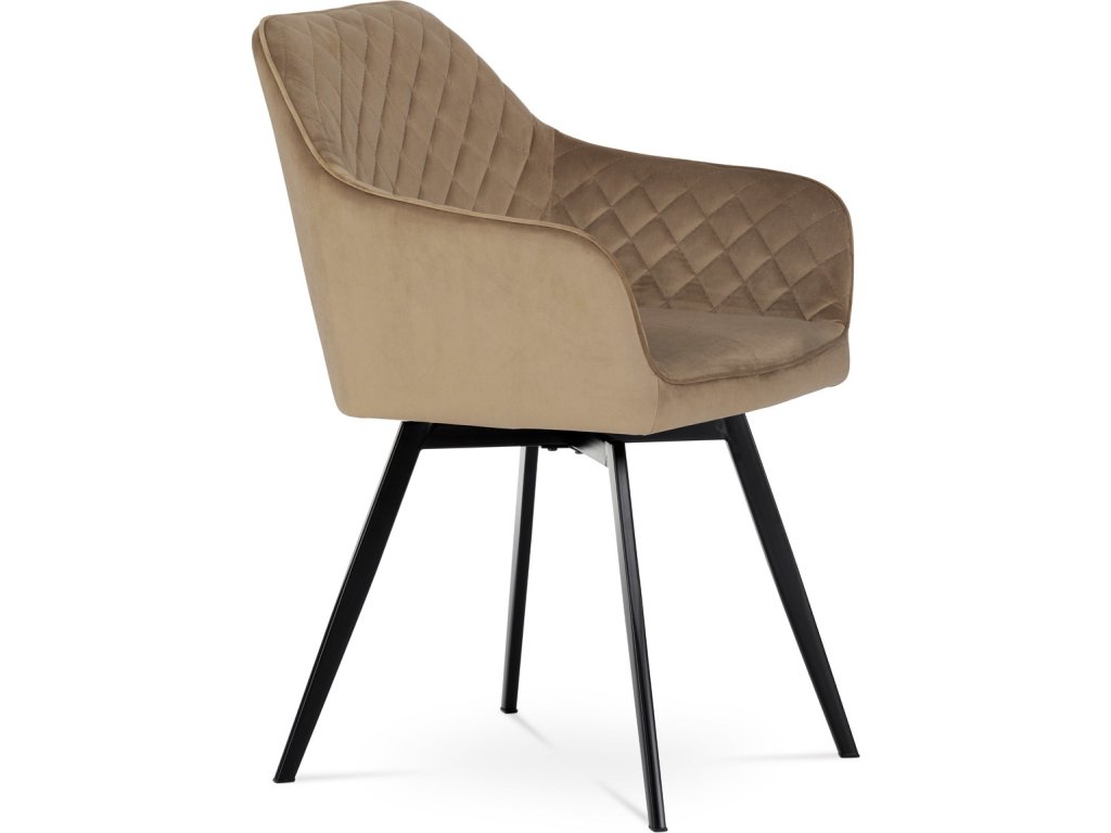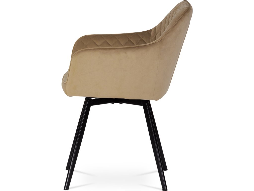 Díky svému dokonalému designu je tato židle v industriálním stylu nezaměnitelná a zároveň velmi pohodlná. Skořepina sedáku a opěradla má potah z kvalitní sametové látky v trendy odstínu zlaté cappuccino v matné úpravě. Polstrování je z PU pěny. Velmi dekorativním prvkem je výrazné kosočtvercové prošití vnitřních ploch v barvě potahu a paspule po obvodu celé skořepiny. Vybraná látka se také velmi dobře čistí. Stabilitu židle zajišťují čtyři kónické kovové nohy obdélníkového průřezu s kvalitním práškovým nástřikem v černé matné barvě. Ukončené jsou černými plastovými kluzáky, zabraňující poškození tvrdých povrchů podlah. Tato provedení produkují z tohoto modelu židle skvělou volbu pro zařízení obývacích či jídelních, ale také zasedacích místností. Nosnost židle je 110 kg. Bonusem této židle je otočný a vratným mechanismus, který umožňuje otáčení o 90° doleva a o 90° doprava a zároveň vždy vrátí sedák do původní polohy. Díky němu žiidle zůstanou vždy srovnané u stolu.