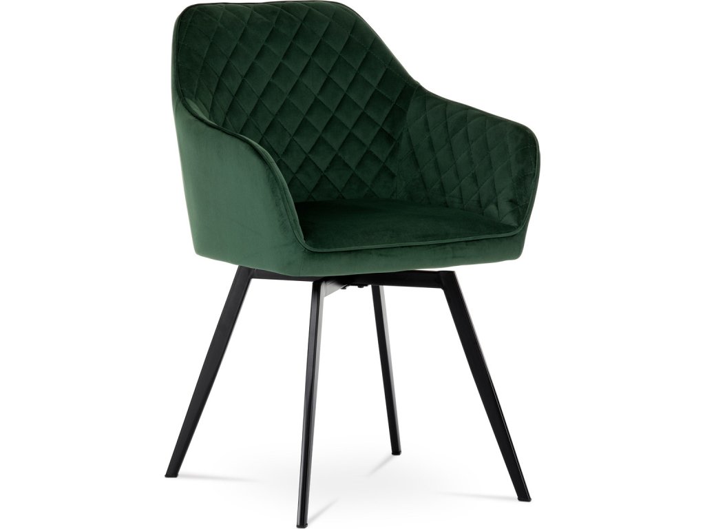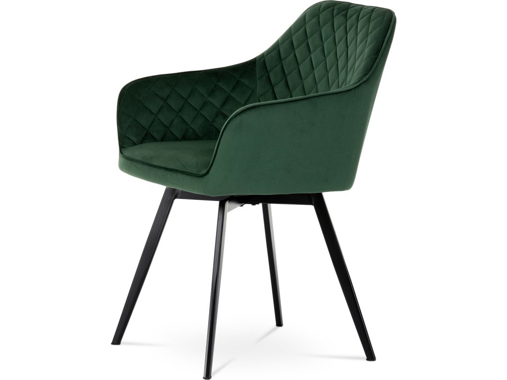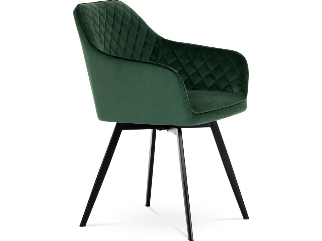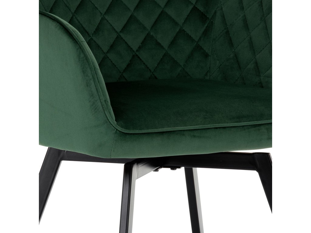 Díky svému dokonalému designu je tato židle v industriálním stylu nezaměnitelná a zároveň velmi pohodlná. Skořepina sedáku a opěradla má potah z kvalitní látky v smaragdově zeleném matném sametu. Polstrování je z PU pěny. Velmi dekorativním prvkem je výrazné kosočtvercové prošití vnitřních ploch v barvě potahu a paspule po obvodu celé skořepiny. Vybraná látka se také velmi dobře čistí. Stabilitu židle zajišťují čtyři kónické kovové nohy obdélníkového průřezu s kvalitním práškovým nástřikem v černé matné barvě. Ukončené jsou černými plastovými kluzáky, zabraňující poškození tvrdých povrchů podlah. Tato provedení produkují z tohoto modelu židle skvělou volbu pro zařízení obývacích či jídelních, ale také zasedacích místností. Nosnost židle je 110 kg. Bonusem této židle je otočný a vratným mechanismus, který umožňuje otáčení o 90° doleva a o 90° doprava a zároveň vždy vrátí sedák do původní polohy. Díky němu žiidle zůstanou vždy srovnané u stolu.