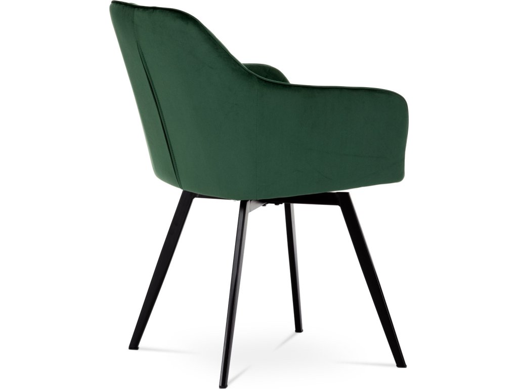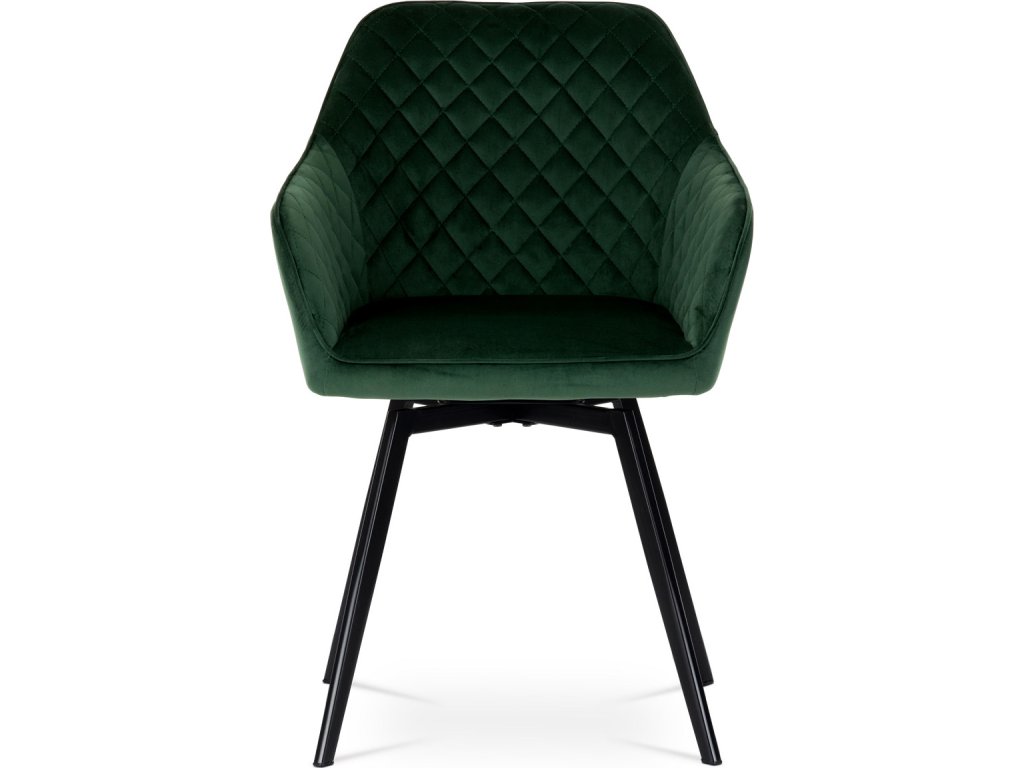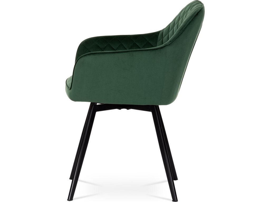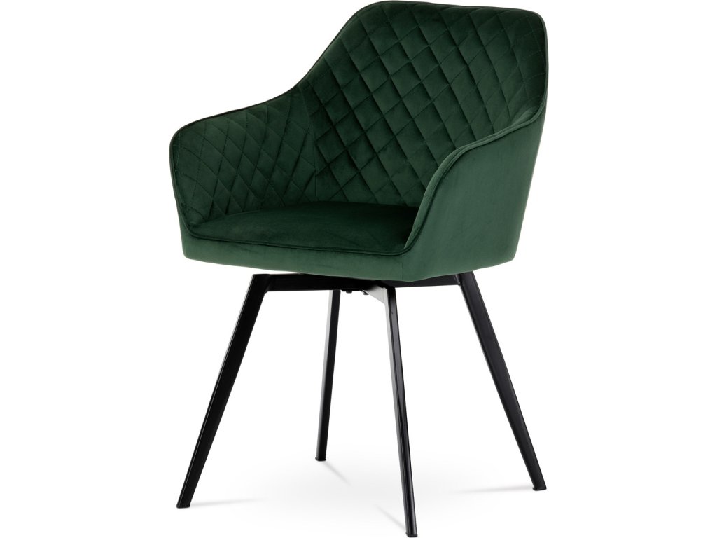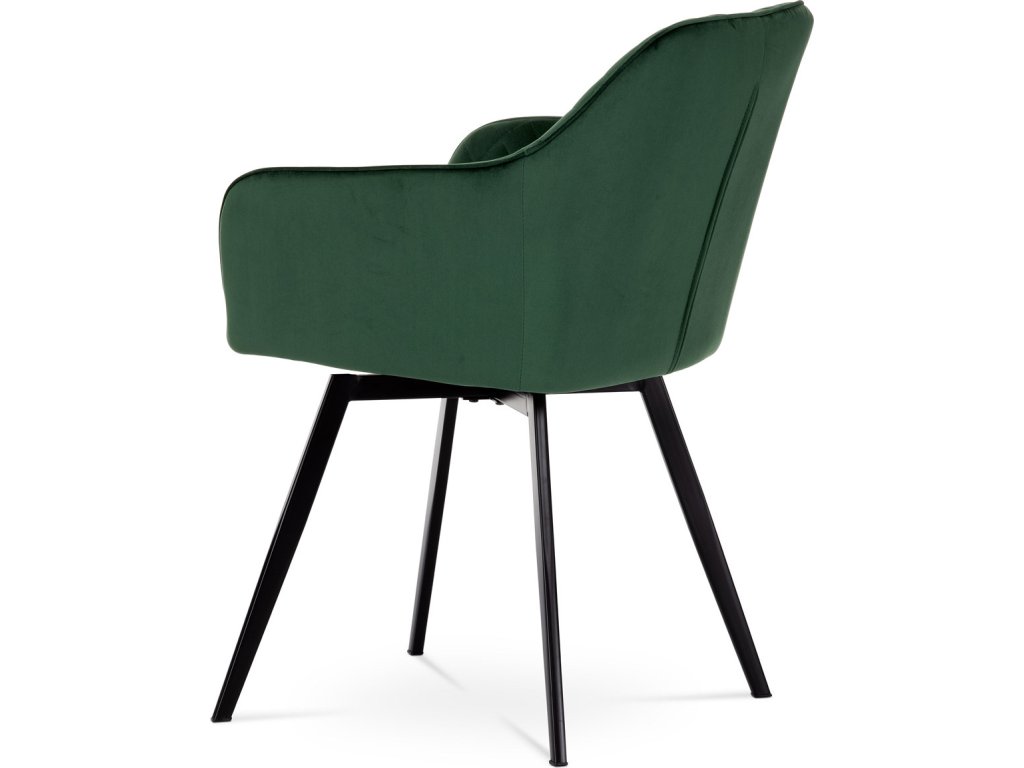 Díky svému dokonalému designu je tato židle v industriálním stylu nezaměnitelná a zároveň velmi pohodlná. Skořepina sedáku a opěradla má potah z kvalitní látky v smaragdově zeleném matném sametu. Polstrování je z PU pěny. Velmi dekorativním prvkem je výrazné kosočtvercové prošití vnitřních ploch v barvě potahu a paspule po obvodu celé skořepiny. Vybraná látka se také velmi dobře čistí. Stabilitu židle zajišťují čtyři kónické kovové nohy obdélníkového průřezu s kvalitním práškovým nástřikem v černé matné barvě. Ukončené jsou černými plastovými kluzáky, zabraňující poškození tvrdých povrchů podlah. Tato provedení produkují z tohoto modelu židle skvělou volbu pro zařízení obývacích či jídelních, ale také zasedacích místností. Nosnost židle je 110 kg. Bonusem této židle je otočný a vratným mechanismus, který umožňuje otáčení o 90° doleva a o 90° doprava a zároveň vždy vrátí sedák do původní polohy. Díky němu žiidle zůstanou vždy srovnané u stolu.