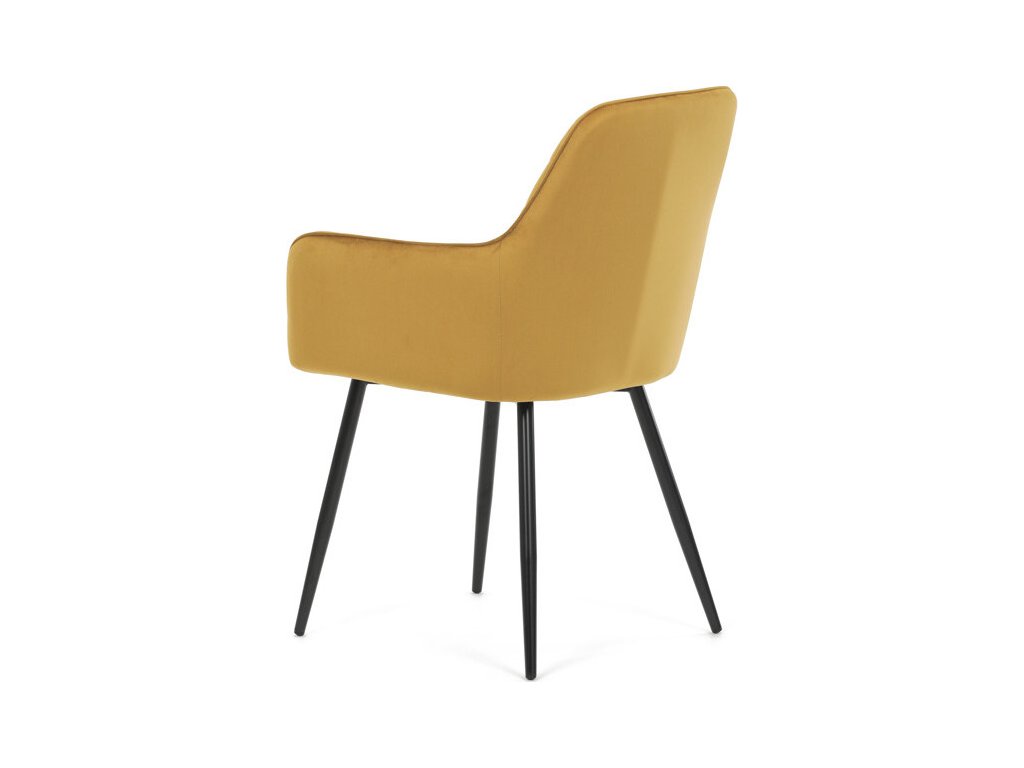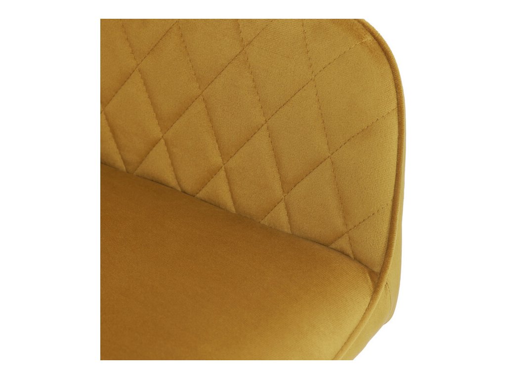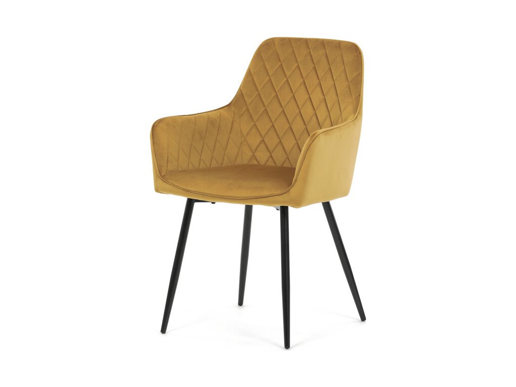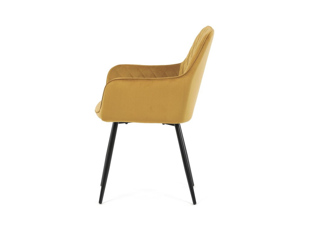 Jídelní židle s označením DCH-215 YEL4 nabízí pohodlné sezení díky čalounění z měkké žluté sametové látky, která je doplněna designovým prošitím v kosočtverečném vzoru na opěradle a područkách. Pevné kovové nohy v černém matném provedení zajišťují stabilitu a dlouhou životnost židle. Ergonomicky tvarované opěradlo s integrovanými područkami podporuje správné držení těla během stolování. Sametová látka je příjemná na dotek a snadno se udržuje, což přispívá k praktickému využití v domácnostech i komerčních prostorách. Židle není otočná, její jednoduchý a zároveň stylový design ji předurčuje k využití v moderních interiérech.