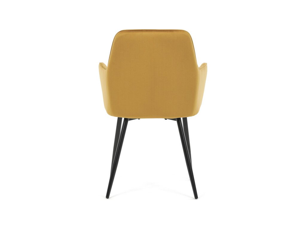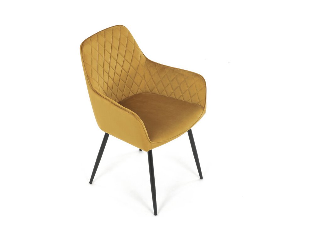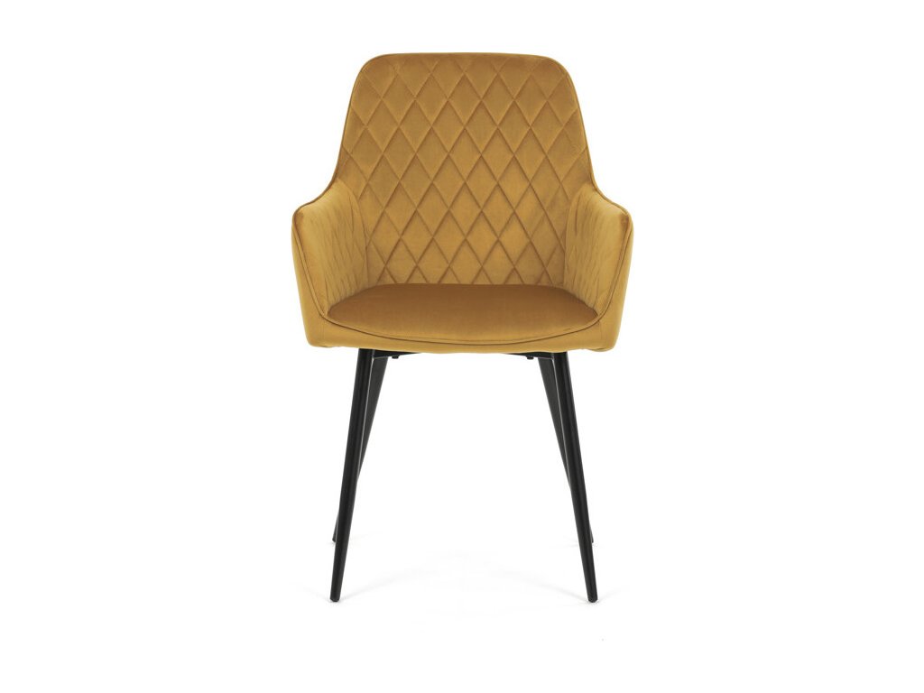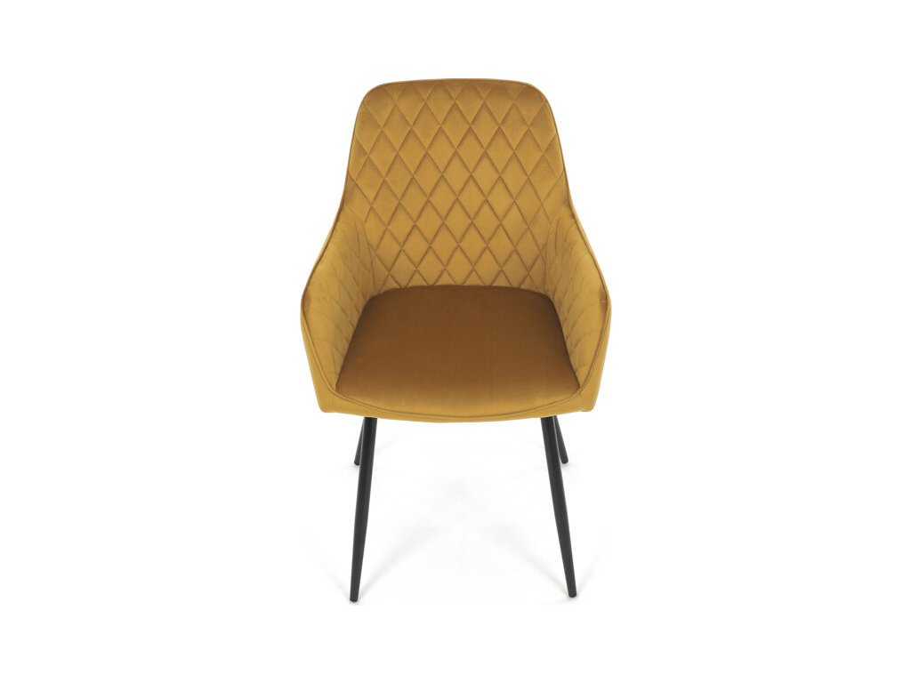 Jídelní židle s označením DCH-215 YEL4 nabízí pohodlné sezení díky čalounění z měkké žluté sametové látky, která je doplněna designovým prošitím v kosočtverečném vzoru na opěradle a područkách. Pevné kovové nohy v černém matném provedení zajišťují stabilitu a dlouhou životnost židle. Ergonomicky tvarované opěradlo s integrovanými područkami podporuje správné držení těla během stolování. Sametová látka je příjemná na dotek a snadno se udržuje, což přispívá k praktickému využití v domácnostech i komerčních prostorách. Židle není otočná, její jednoduchý a zároveň stylový design ji předurčuje k využití v moderních interiérech.
