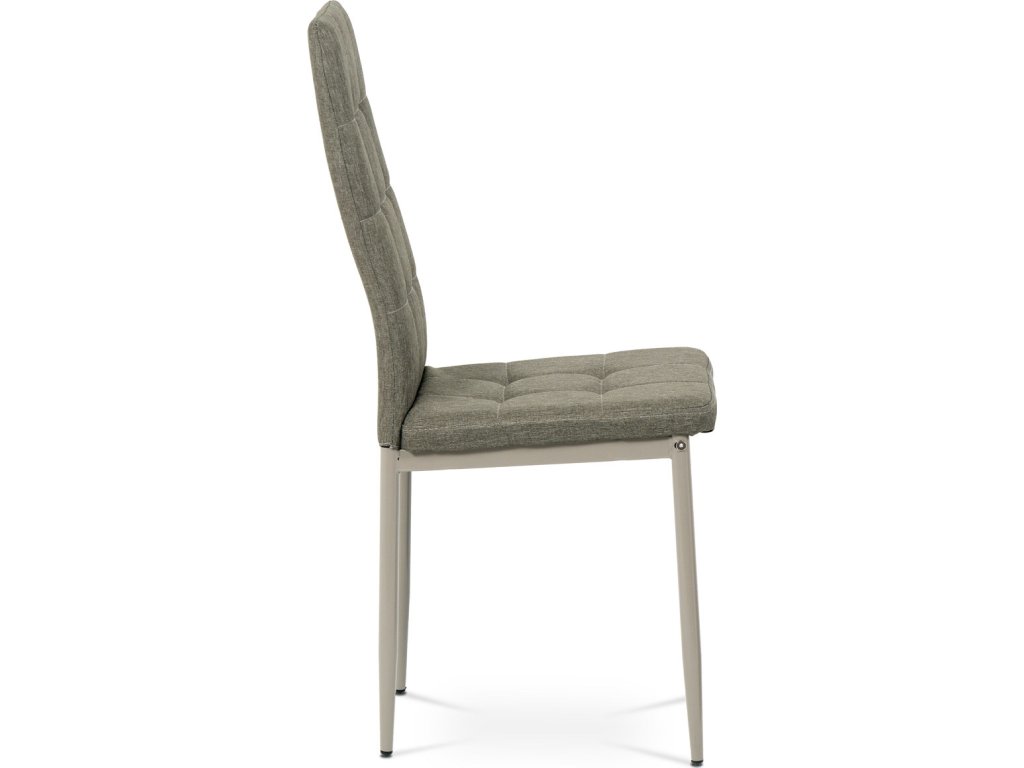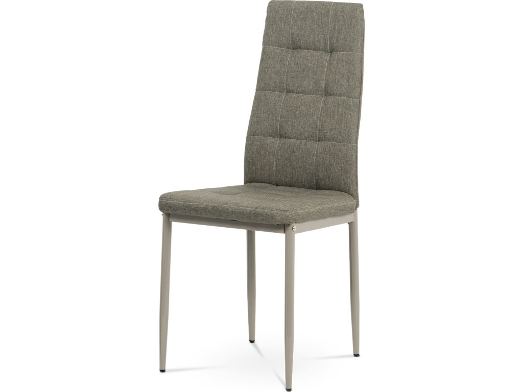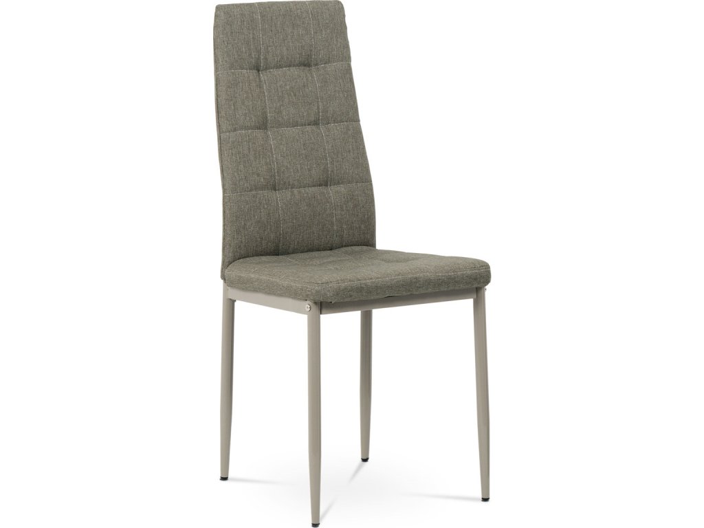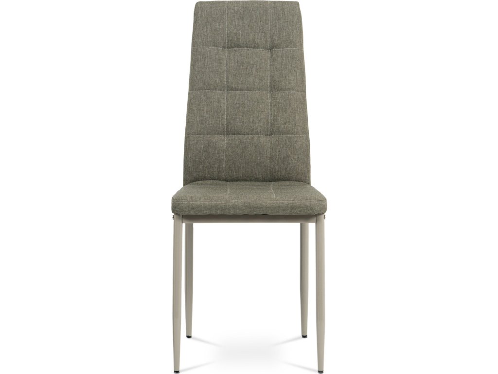 Jídelní židle v industriálním stylu a minimalistickém designu. Je potažena středně hrubou látkou v trendy odstínu dark cappuccino s výrazným čtvercovým prošitím s čalounickými vtahy sedáku i opěráku. Polstrování je z kvalitní PU pěny. Čtyřnohá podnož je kovová, s povrchovou úpravou cappuccino matnou práškovou barvou. Nohy jsou kruhového průřezu a kónické, na koncích jsou opatřeny černými plastovými kluzáky, které minimalizují nebezpečí poškození povrchu podlahy na minimum. Nosnost židle je až 110 kg. Tato židle najde platné využití v prostorách domácí jídelny či kuchyně.
