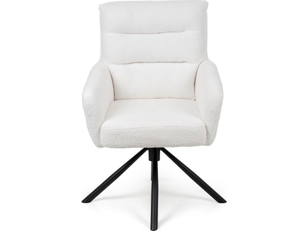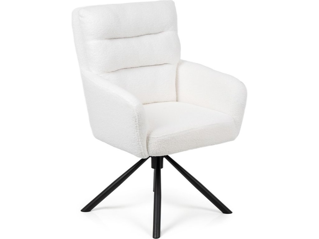 Moderní otočná židle s područkami a elegantním vzhledem. Pohodlné čalounění v bílé látce s měkkým povrchem. Stabilní kovová podnož s otočnou funkcí. Skvěle se hodí do jídelny, pracovny i kanceláře. Spojuje komfort, luxusní design a nadčasovou eleganci.