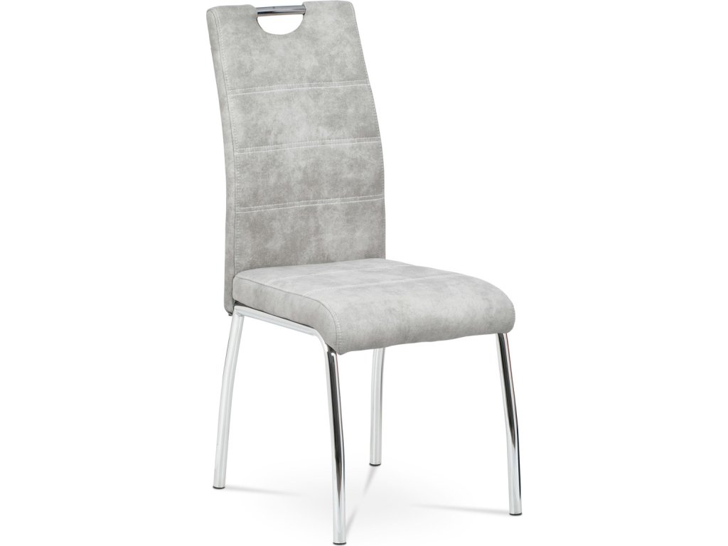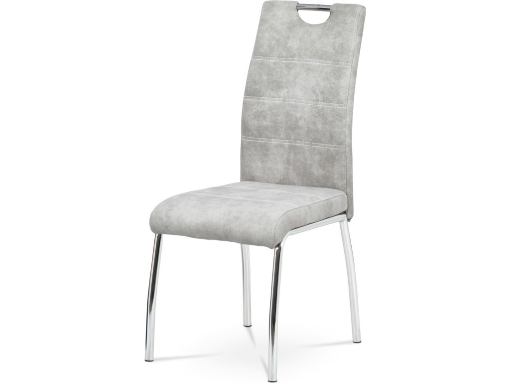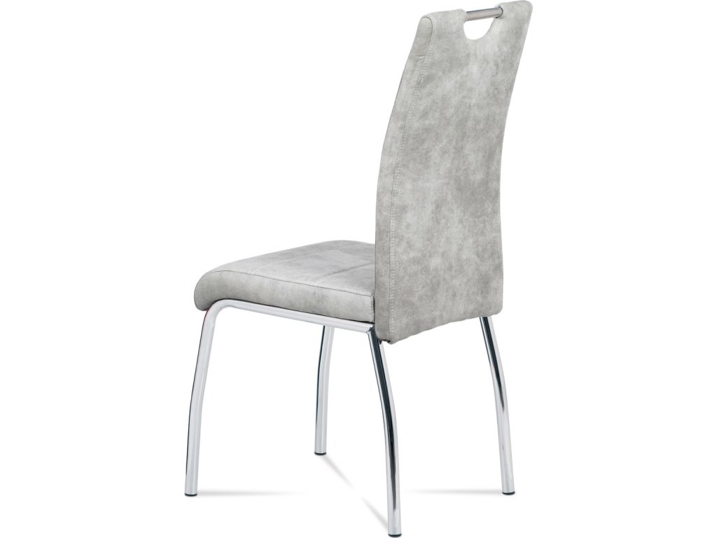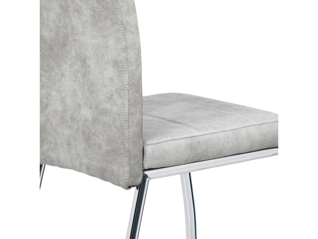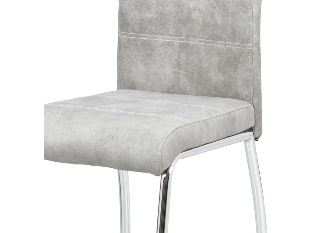 Jídelní židle s označením HC-486 SIL3 nabízí kombinaci moderního designu a praktického provedení. Potah je z kvalitní látky v odstínu stříbrné s efektem vintage kůže, která dodává židli charakter a snadnou údržbu. Čalouněné sedadlo a opěradlo jsou ergonomicky tvarované pro pohodlné sezení během jídel i delších posezení. Stabilní kovová čtyřnohá podnož s chromovaným povrchem zajišťuje pevnost a stabilitu celé židle. Židle nemá područky ani výškové nastavení, což umožňuje snadné zasunutí pod stůl a úsporu místa v prostoru.