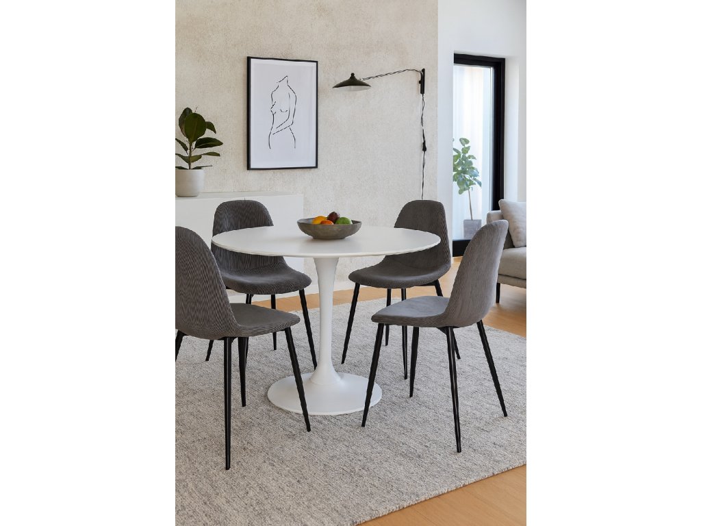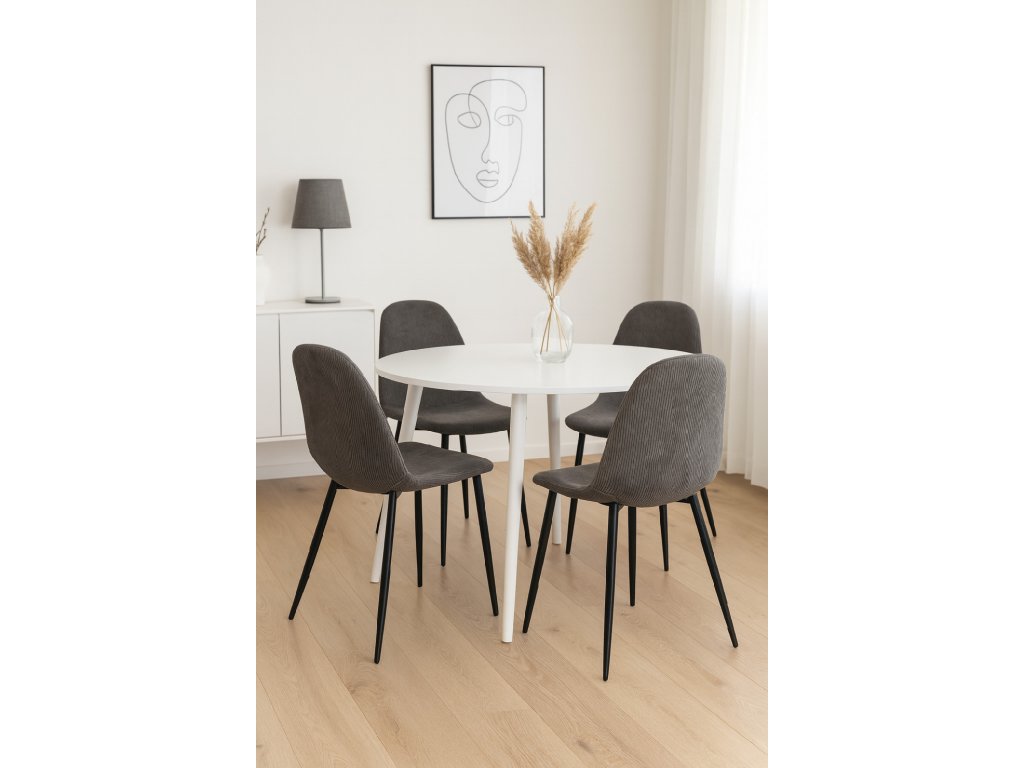 Elegantní židle s moderním minimalistickým vzhledem. Pohodlné čalounění v šedém manšestrovém provedení. Stabilní kovové nohy v černém provedení. Ideální doplněk do jídelny, kuchyně i pracovny. Spojuje komfort, nadčasový design a odolnost.