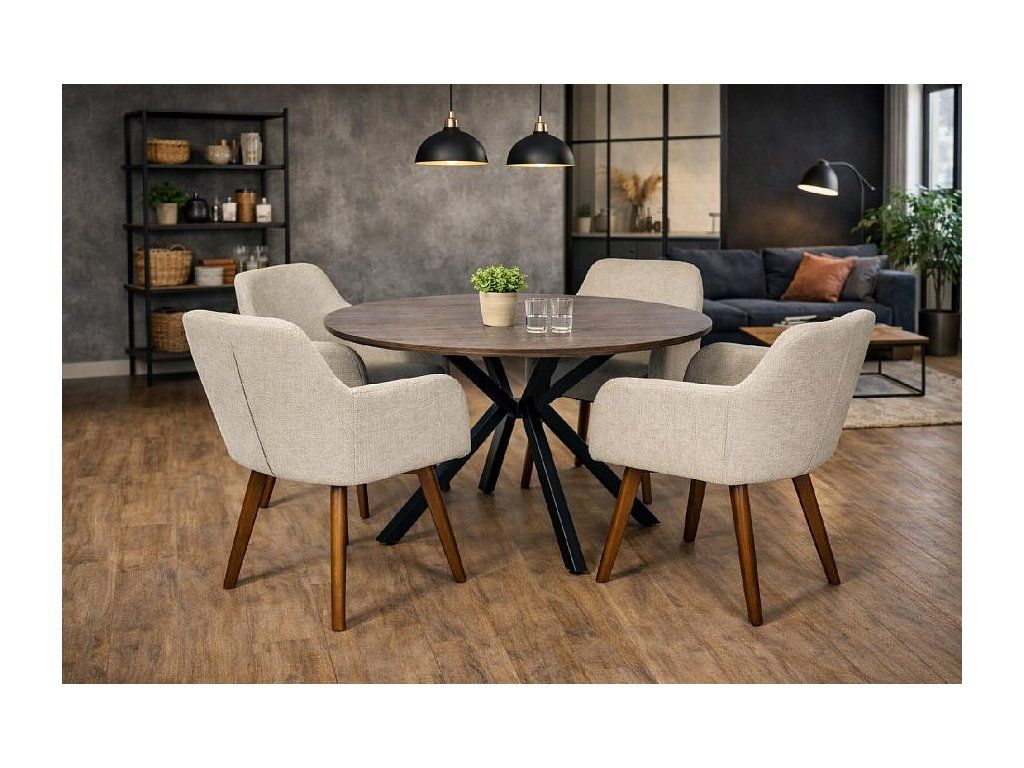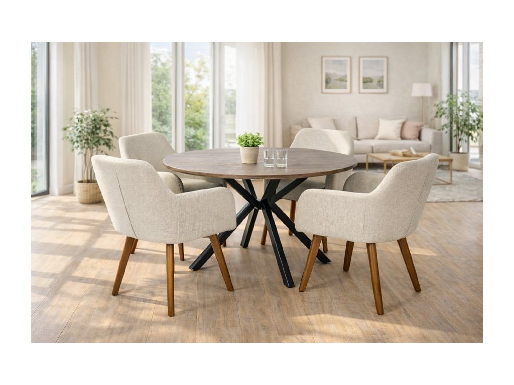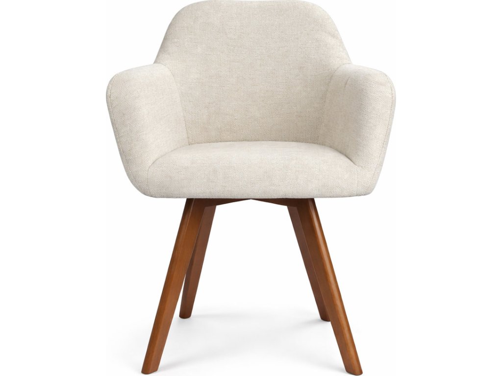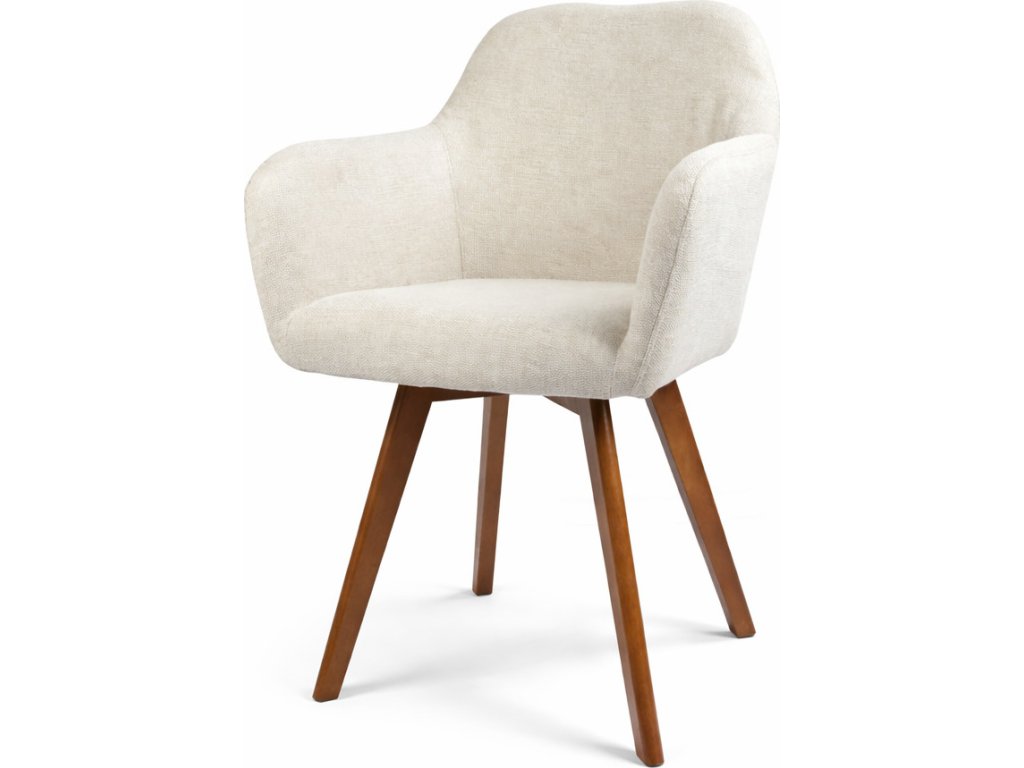 Kvalitní textilní potah v neutrálním světlém odstínu působí lehce a elegantně, zatímco masivní dřevěné nohy dodávají židli pevnost a vizuální teplo. Díky kombinaci komfortu a designu je ideální volbou pro každodenní používání i reprezentativní prostory.