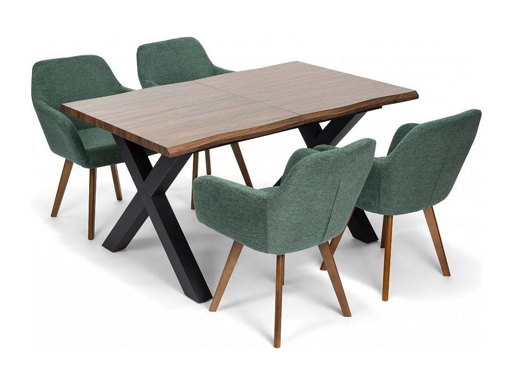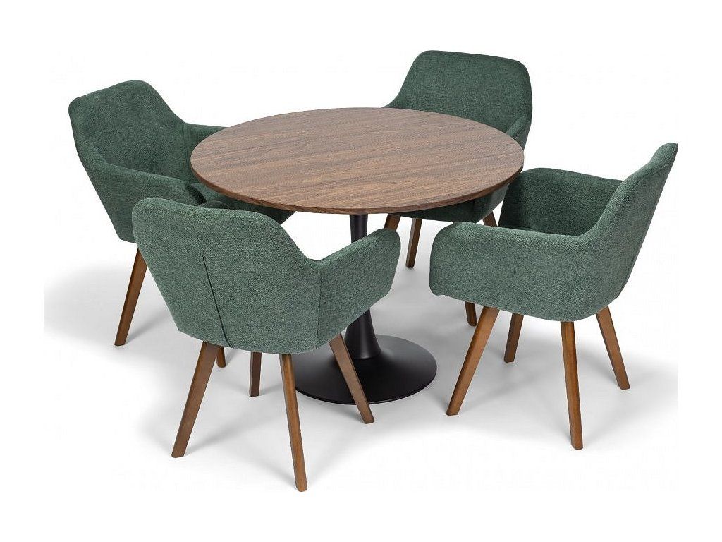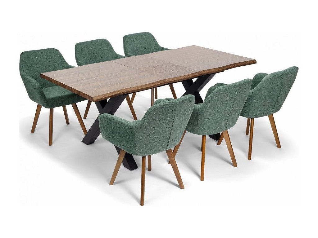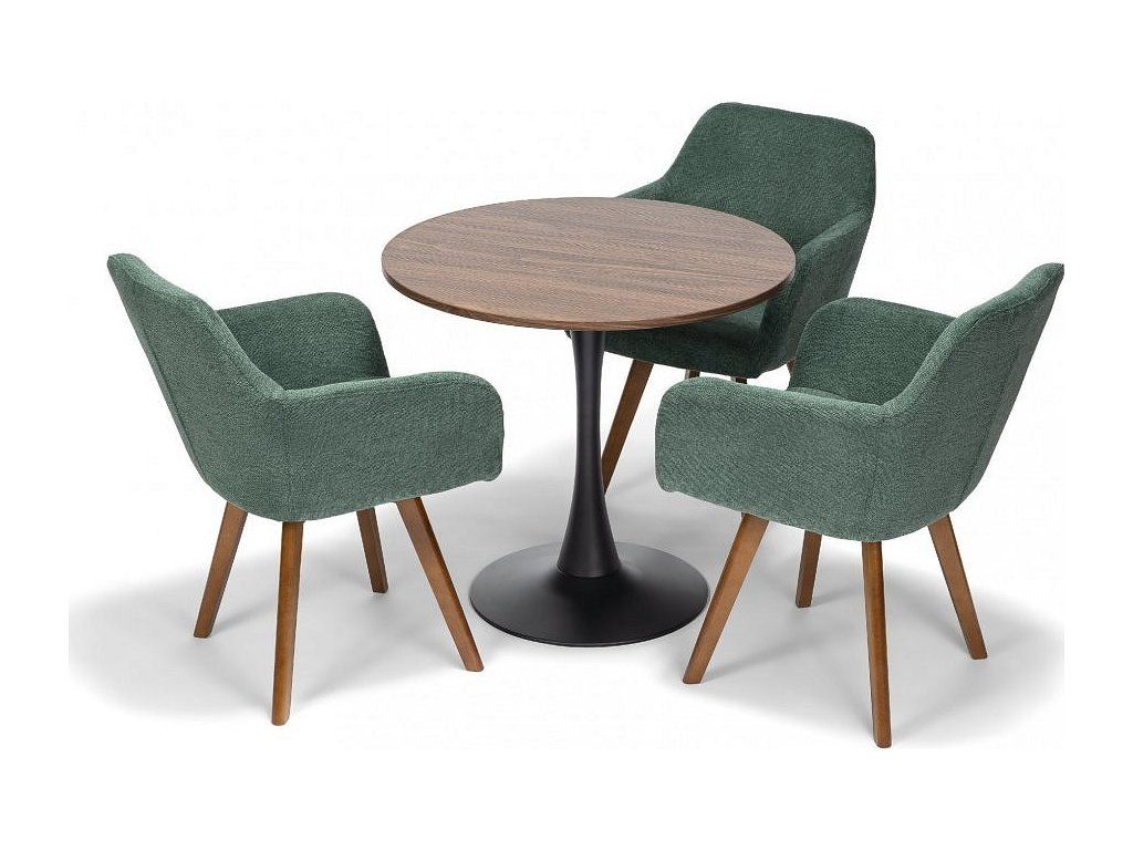 Kvalitní textilní potah v zeleném odstínu působí lehce a elegantně, zatímco masivní dřevěné nohy dodávají židli pevnost a vizuální teplo. Díky kombinaci komfortu a designu je ideální volbou pro každodenní používání i reprezentativní prostory.