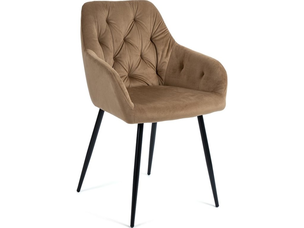 Elegantní židle s područkami a moderním designem. Pohodlné čalounění v béžovém sametu s dekorativním prošíváním. Stabilní kovové nohy v černém provedení. Skvěle doplní jídelnu, pracovnu či obývací pokoj. Spojuje komfort, styl a luxusní vzhled.