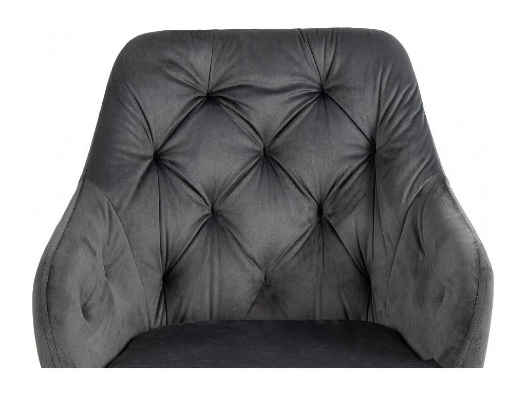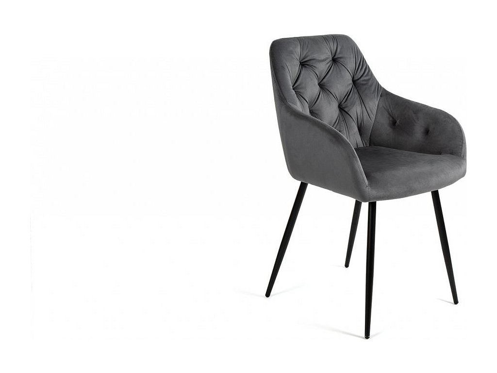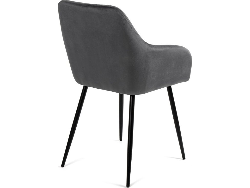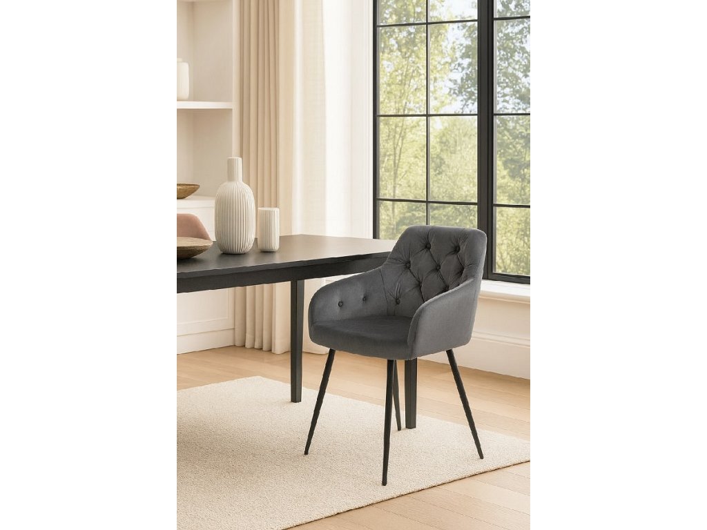 Moderní židle s elegantním designem a područkami. Pohodlné čalounění v šedém sametu s dekorativním prošíváním. Stabilní kovové nohy v černém provedení. Vhodná do jídelny, pracovny i obývacího pokoje. Spojuje komfort, styl a luxusní vzhled.