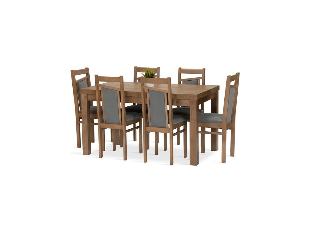 Jídelní sestava Magnum 6 se skládá z rozkládacího stolu a šesti židlí. Tato jídelní sestava splní svůj účel na výbornou nejen v kuchyni, ale i v jídelně, nebo obývacím pokoji s jídelním koutem. Svou vysokou kvalitou a precizním zpracováním, uspokojí všechny budoucí, i ty velmi náročné, uživatele. Nohy stolu a kostry židlí jsou vyrobeny z bukového dřeva, mořeného tak, aby ladily s deskou stolu, která je vyrobená z lamina v dekoru dub lefkas. Jídelní sestava je dodávaná v demontu. Součástí balení je schématický montážní návod, včetně všech potřebných spojovacích prvků. Cena je uvedena za jídelní stůl a 6 židlí. Úvodní fotografie je ilustrační. Židle budou dodány v modré barvě.