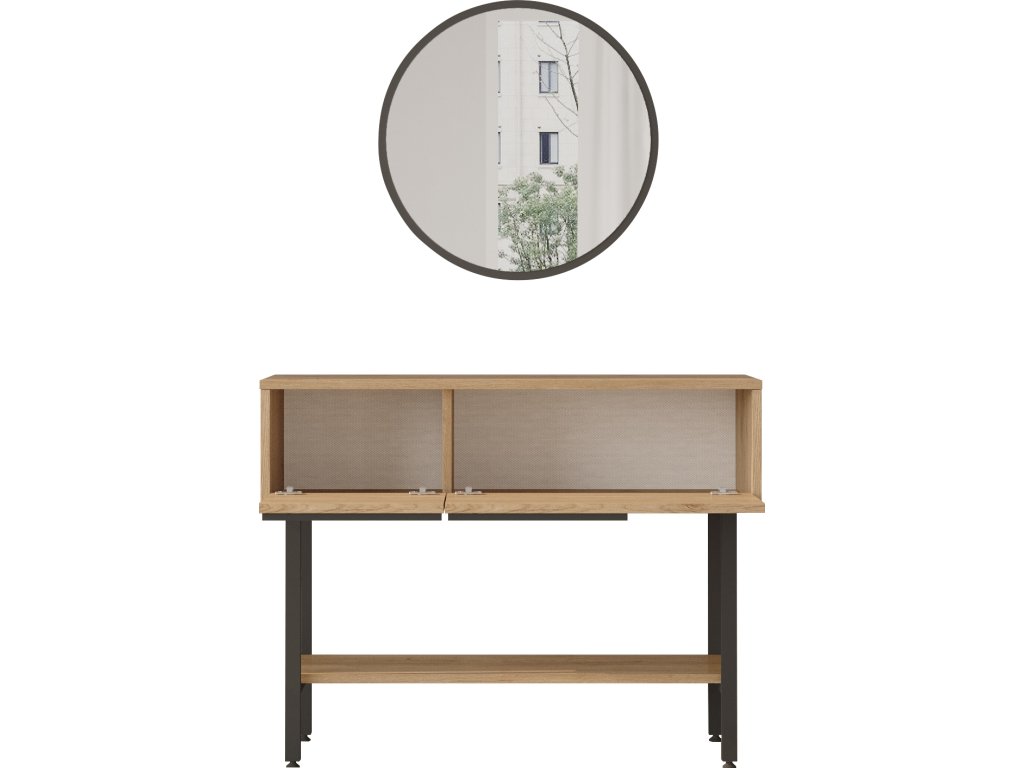 Konzolový stolek je ideálním doplňkem pro moderní obývací pokoj nebo předsíň. Spojení kvalitního LTD materiálu a kovu zajišťuje dlouhou životnost a atraktivní vzhled. Tento stolek s obdélníkovým tvarem, zrcadlem, dvěma plnými dvířky a odkládací policí přináší kombinaci praktičnosti a elegance.