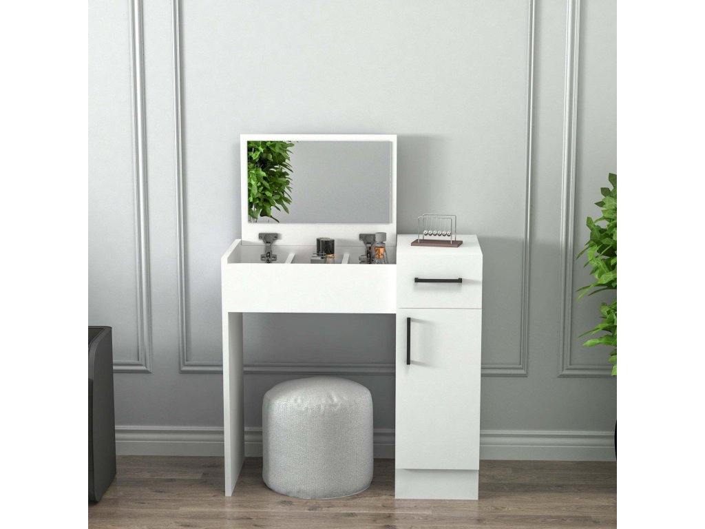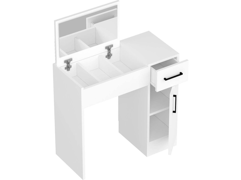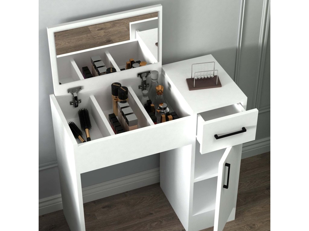 Toaletní stolek je ideálním řešením pro každou ložnici, kde je kladen důraz na estetiku a praktičnost. Tento moderní stolek nabízí chytré úložné prostory, včetně zásuvky, plného dvířka a výklopné horní desky se zrcadlem. Díky svému elegantnímu designu a kvalitnímu provedení se snadno stane stylovým doplňkem vašeho interiéru.