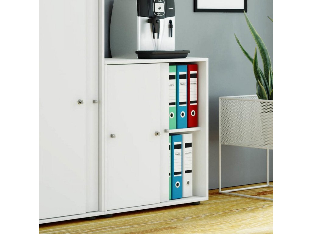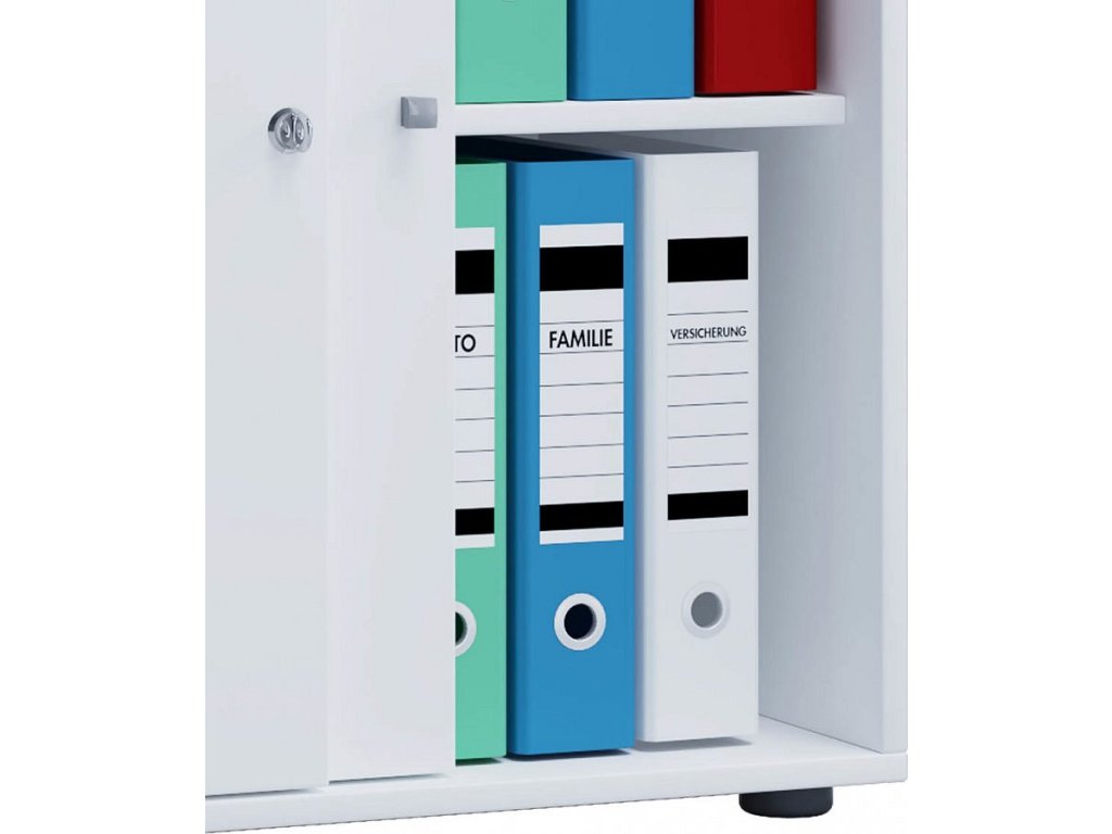 Skříň poskytuje dostatek úložného prostoru, například pro 14 složek, ale i mnoho dalšího. Praktické posuvné dveře jsou opatřeny zámkem.
