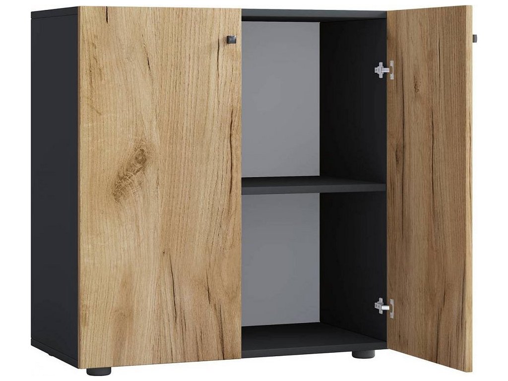 Nízká skříň Lona se dvěma dvířky je ideální jako skříň na šanony. Díky čistému a nadčasovému vzhledu ji snadno zkombinujete s dalším nábytkem do kanceláře a vytvoříte tak ucelený, přehledný pracovní prostor. Korpus je vyroben z kvalitní imitace dřeva s pevnou zadní deskou, což zajišťuje stabilitu a dlouhou životnost. Odolné kovové kování umožňuje pohodlné každodenní používání. Uvnitř se nachází výškově nastavitelná police, která nabízí flexibilitu uložení a poskytuje kapacitu až pro 14 šanonů.