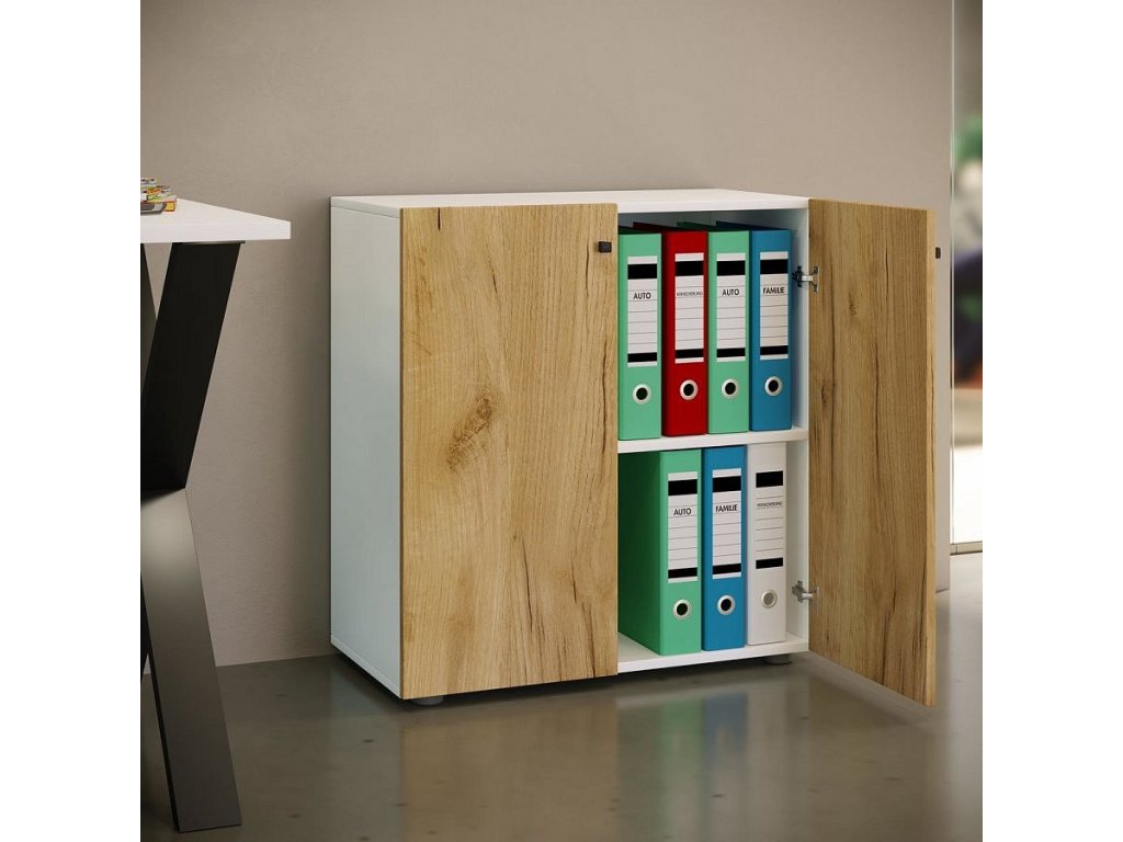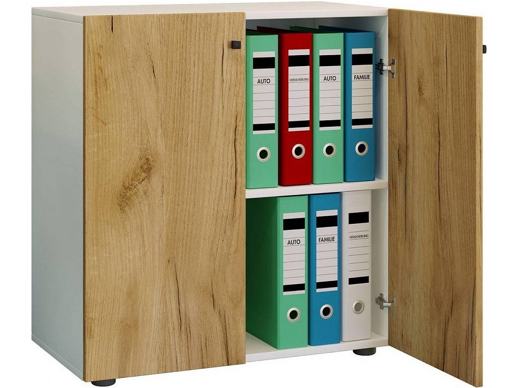 Nízká skříň Lona se dvěma dvířky je ideální jako skříň na šanony. Díky čistému a nadčasovému vzhledu ji snadno zkombinujete s dalším nábytkem do kanceláře a vytvoříte tak ucelený, přehledný pracovní prostor. Korpus je vyroben z kvalitní imitace dřeva s pevnou zadní deskou, což zajišťuje stabilitu a dlouhou životnost. Odolné kovové kování umožňuje pohodlné každodenní používání. Uvnitř se nachází výškově nastavitelná police, která nabízí flexibilitu uložení a poskytuje kapacitu až pro 14 šanonů.