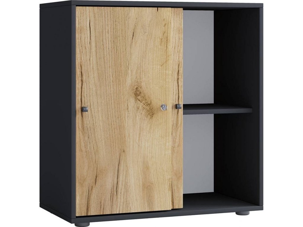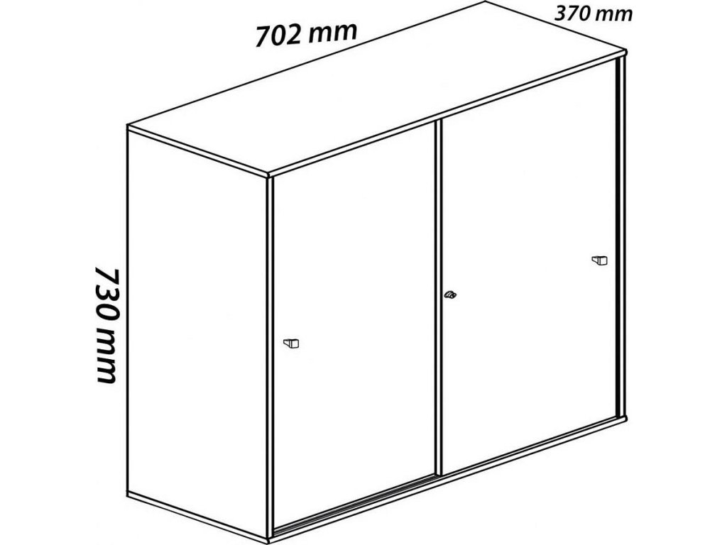 Skříň je vybavena jednou nastavitelnou policí a dvěma uzamykatelnými posuvnými dveřmi, které chrání obsah před prachem i nechtěným přístupem.
