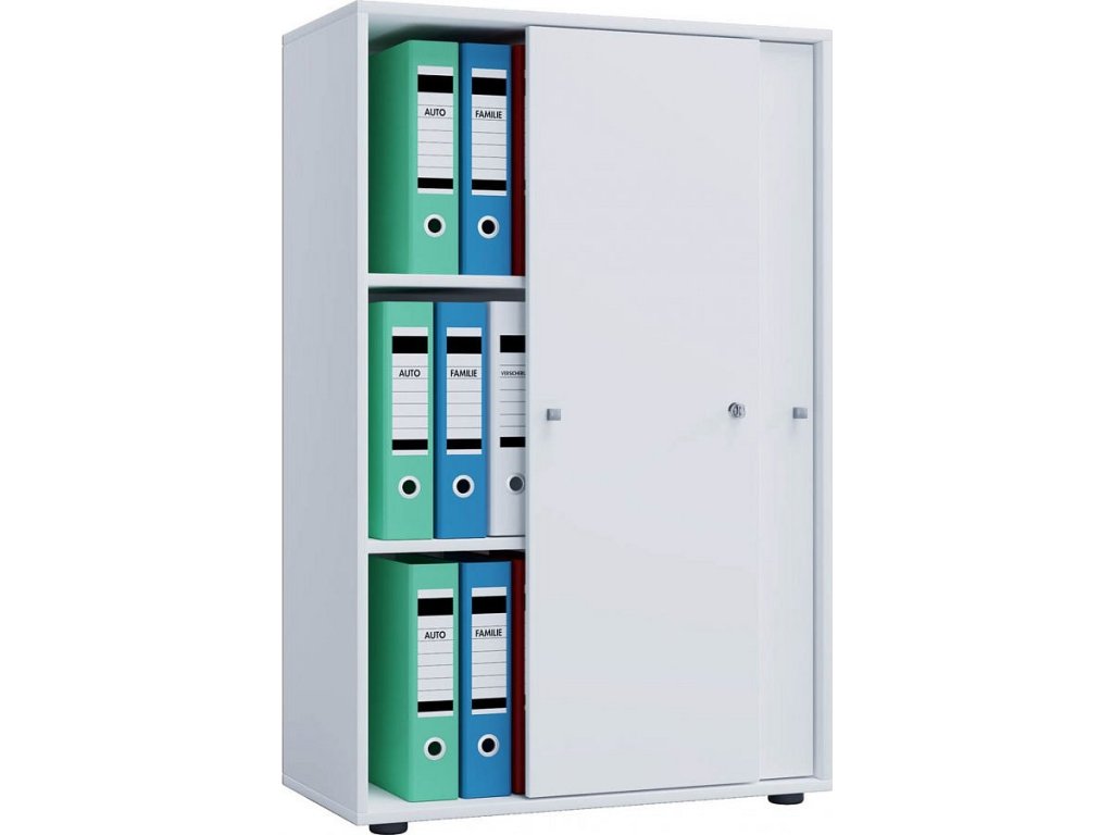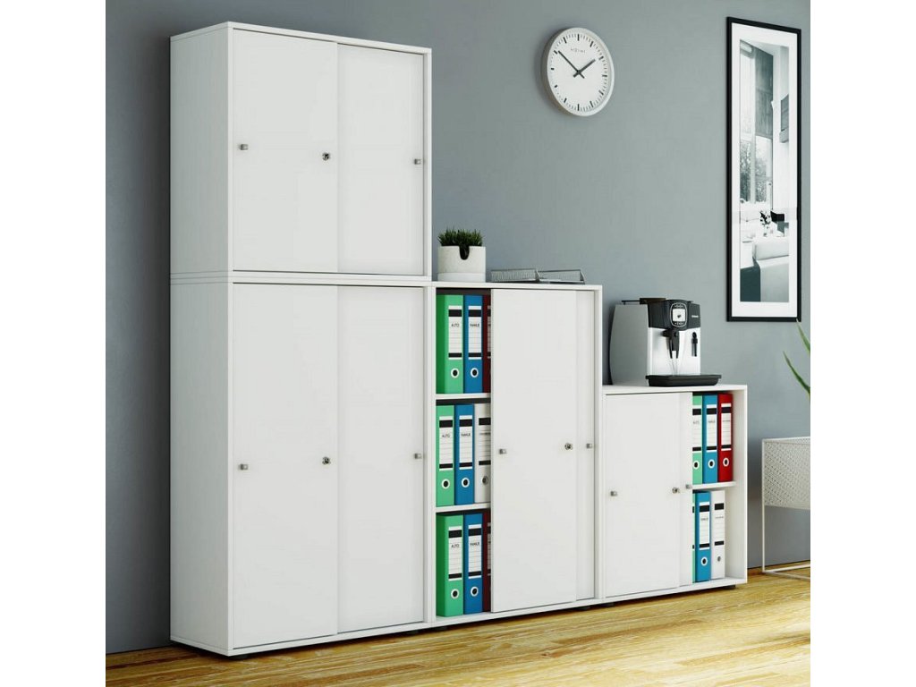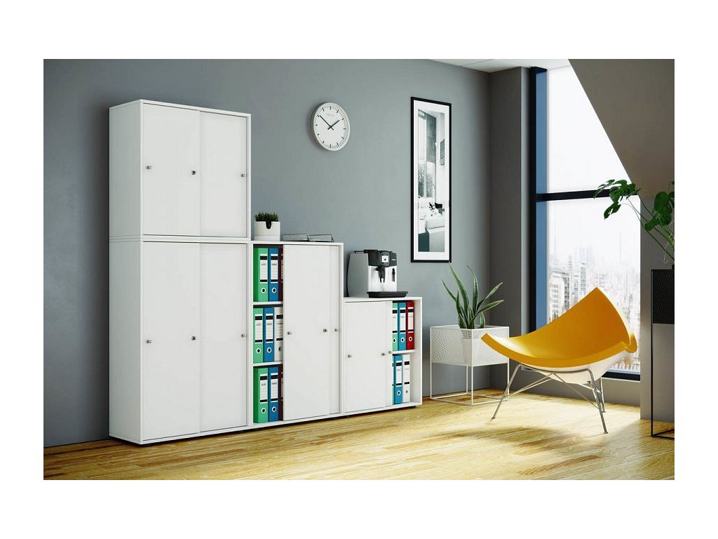 Skříň se dvěma variabilními policemi poskytuje dostatek úložného prostoru, například pro 21 složek, ale i mnoho dalšího. Praktické posuvné dveře jsou opatřeny zámkem.