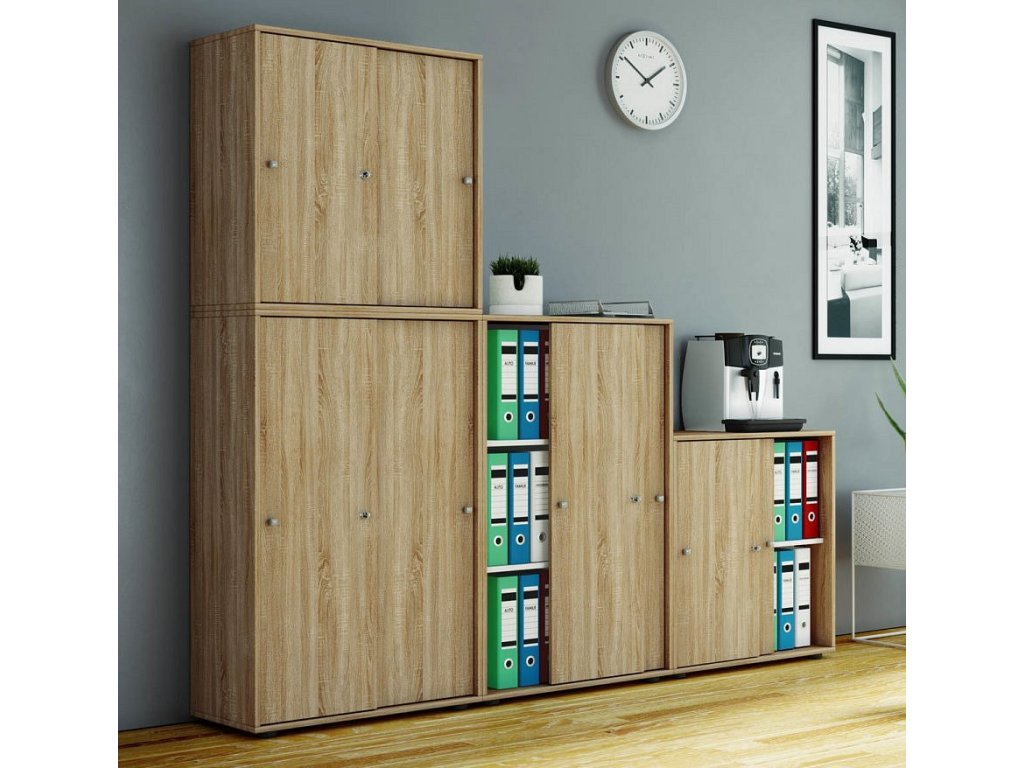 Skříň se dvěma variabilními policemi poskytuje dostatek úložného prostoru, například pro 21 složek, ale i mnoho dalšího. Praktické posuvné dveře jsou opatřeny zámkem.