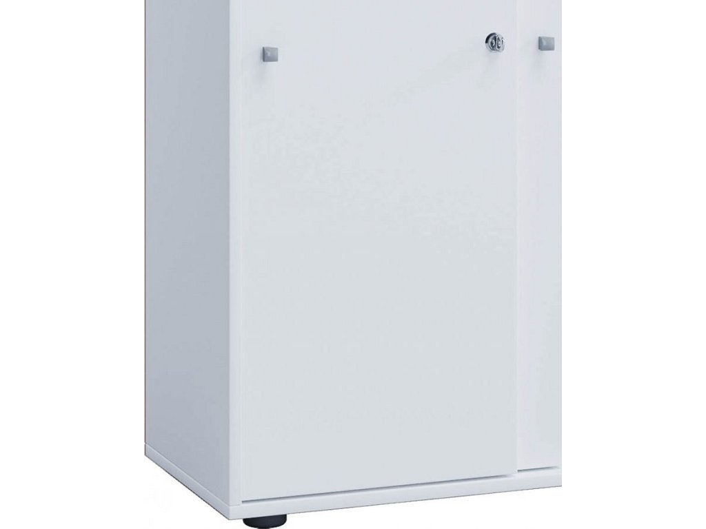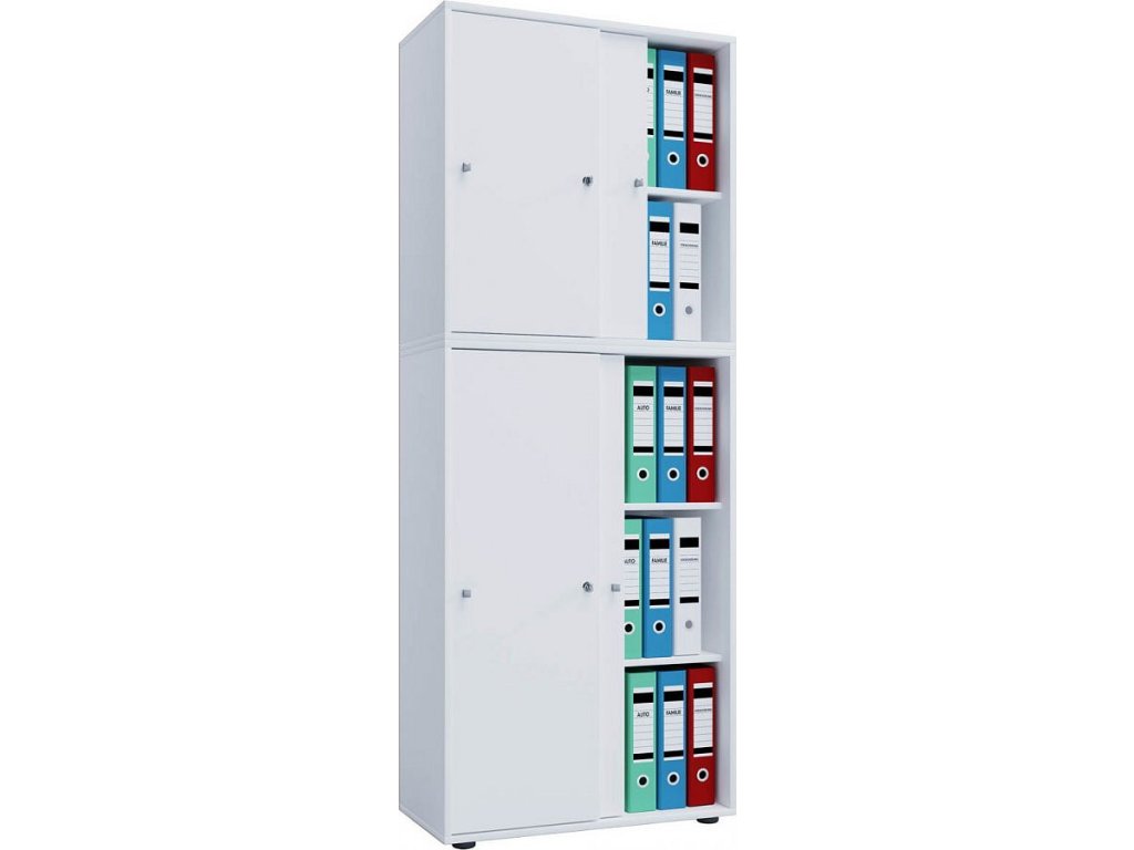 Skříň se čtyřmi policemi poskytuje dostatek úložného prostoru, například pro 35 složek, ale i mnoho dalšího. Praktické posuvné dveře jsou opatřeny zámkem.